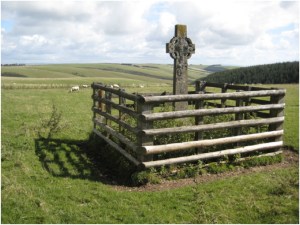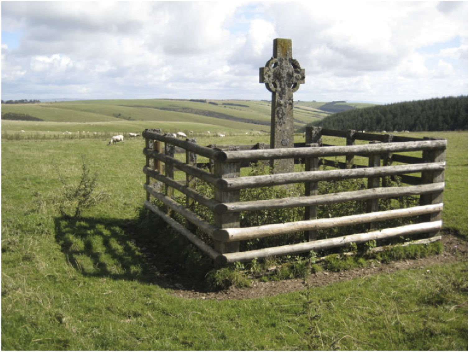 The present position of the stone is within England but at one time it stood on the border. The importance of the stone (which is simply a flat stone with writing – now placed beneath the cross) is in marking the boundary of Bettws parish, due to their having buried a body found nearby – and later then claiming that such an action indicated that their parish covered as far as this point.