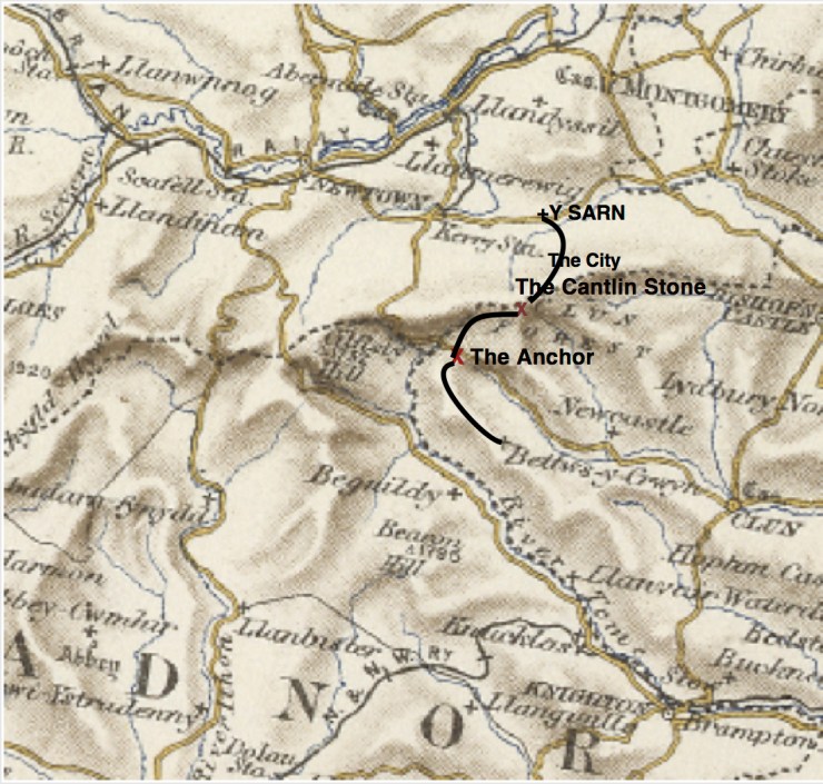 The route from Sarn Church passes through ‘The City’, past The Cantlin Stone & The Anchor.