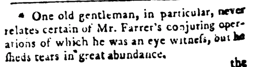 “Fortunately however for this part of the country during the life of Mr Fairer, the people were provided with an anti-conjuror who was able to defeat the combined efforts of them and their able patron. His fame became widely discussed and wherever the account of his actions was reported he seemed like Virgil’s allegorical figure crescere eundo. If the spouse was jealous that the heart of her husband was estranged from her, she immediately consulted the anti-conjuror, and desired him to restore the affections of her bewitched partner. If a friend or relative was confined to the bed of sickness, relief and convalescence could not be expected without the supernatural assistance and balsamic medicines of Mr Fairer. If a person became deranged in his intellects the injured cells of the brain were to be healed and adjusted by the magic charms of this celebrated man. If a farmer happened to lose his cattle it was necessary to purify the walls of the house with water sprinkled by this famous conjuror; and in endeavouring to account for the latent cause of this disaster, he generally found small parcels of heterogeneous matter deposited in the walls and consisting of the legs of mice and the wings of bats; which he affirmed to be the work of witches. If a person was desirous of knowing the issue of any event he repaired to Mr Fairer who failed not to satisfy him in this particular.”