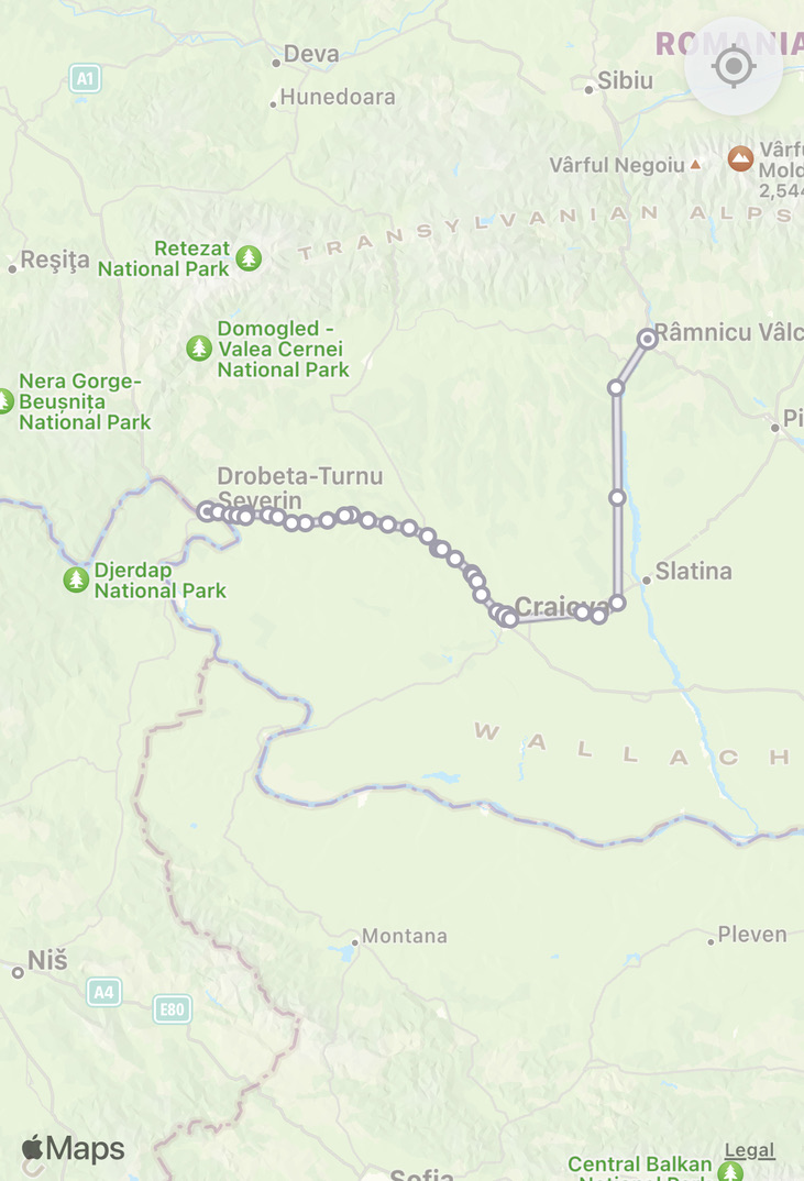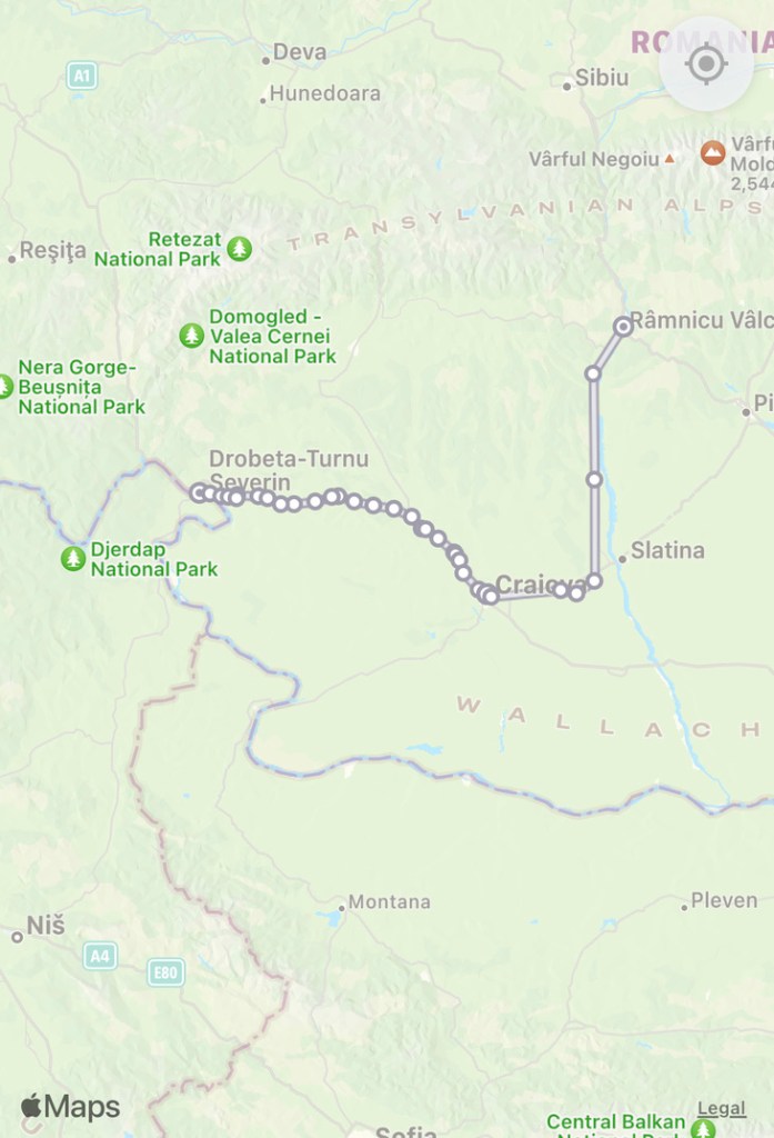 Turnu Séverin (the Dobreta element was added in Communist times). A peaceful place with many wooded areas. It was here that the Danube was bridged by the Emperor Trajan who then proceeded to invade and exploit (violently) the gold resources of the region. The ‘victory’ is celebrated in the Arch in Rome… with locals being taken to Rome as slaves. Later the Emperor Hadrian had a more defensive attitude and destroyed the bridge in order to prevent Barbarians on the north bank invading the Empire. Hadrian did the same in Brittania …. Sealing the empire with a wall (to keep the dreadful northern barbarians under control). We now call this northern barbarian area ‘Scotland’.