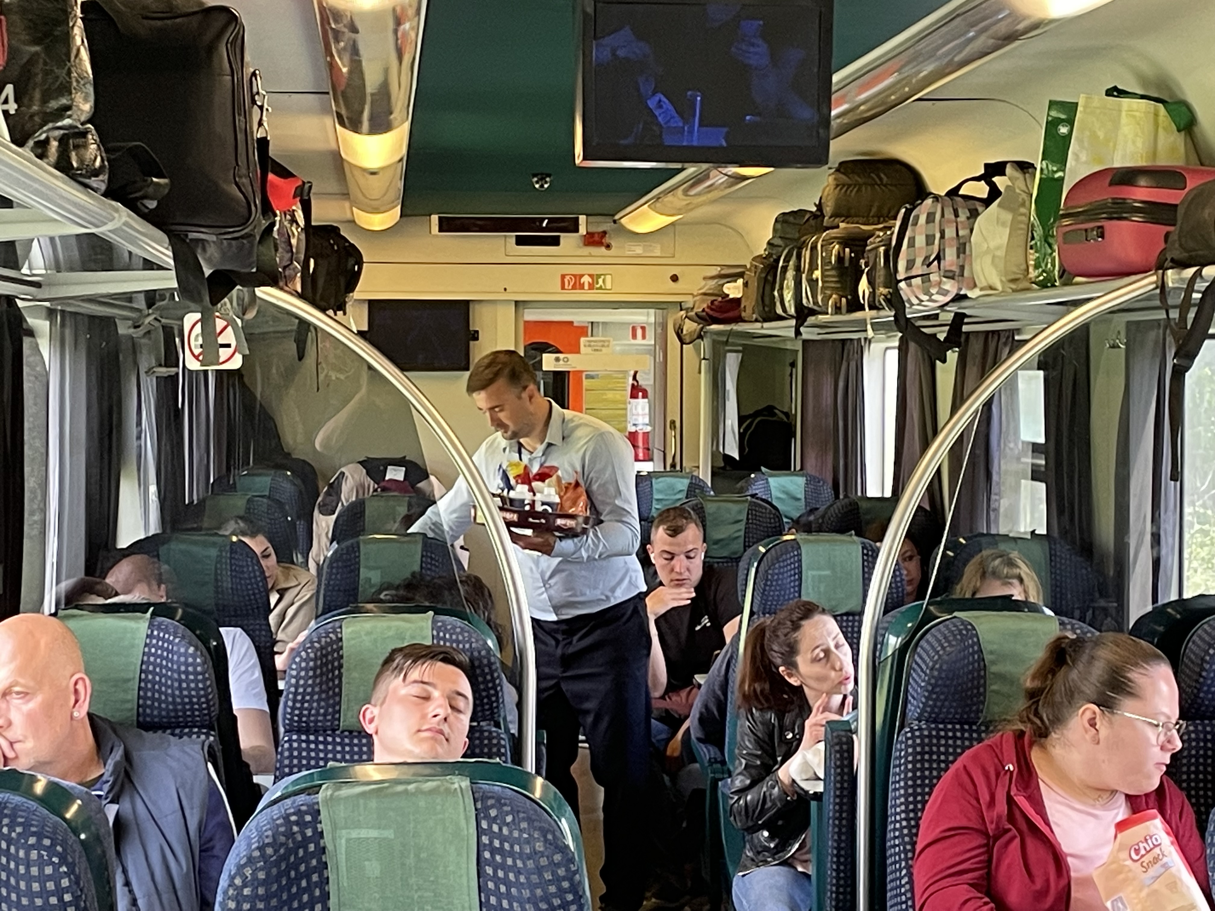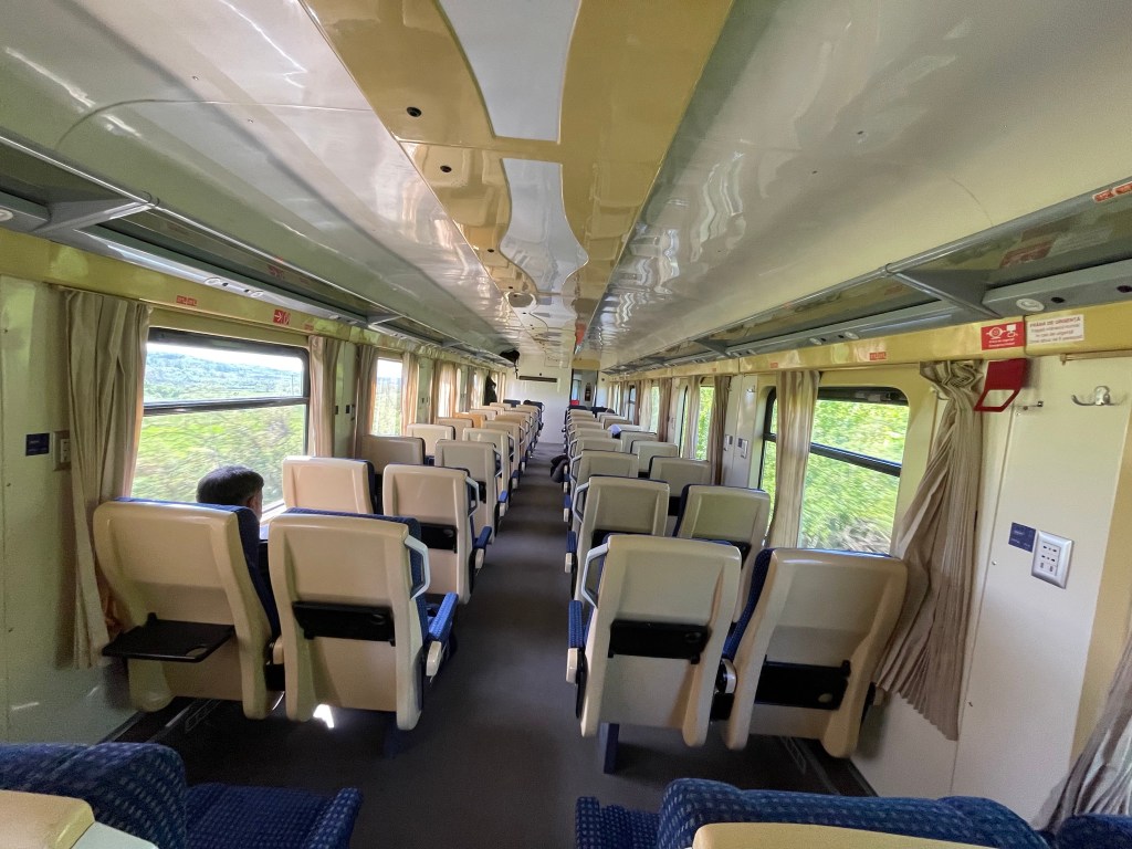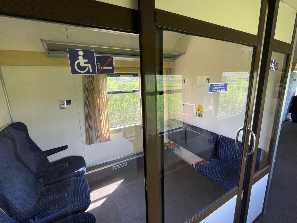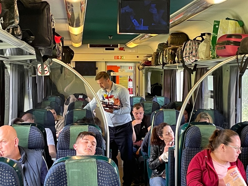 An unusual experience – at seat service provided by the Romanian staff. The only other time this occurred (outside the UK) was on a Danish train during Journey One (though it happens on Finnish trains & in Germany drinks and food can be ordered then delivered). In general the provision of restaurant meals has reduced everywhere in Europe.