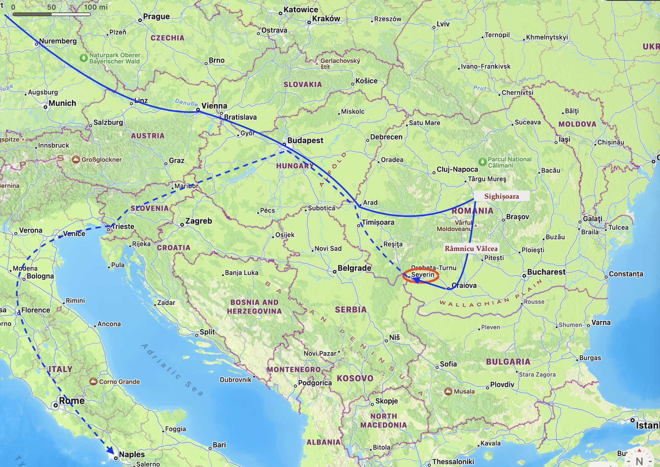 The route taken to Severin & that for the next 4 days.