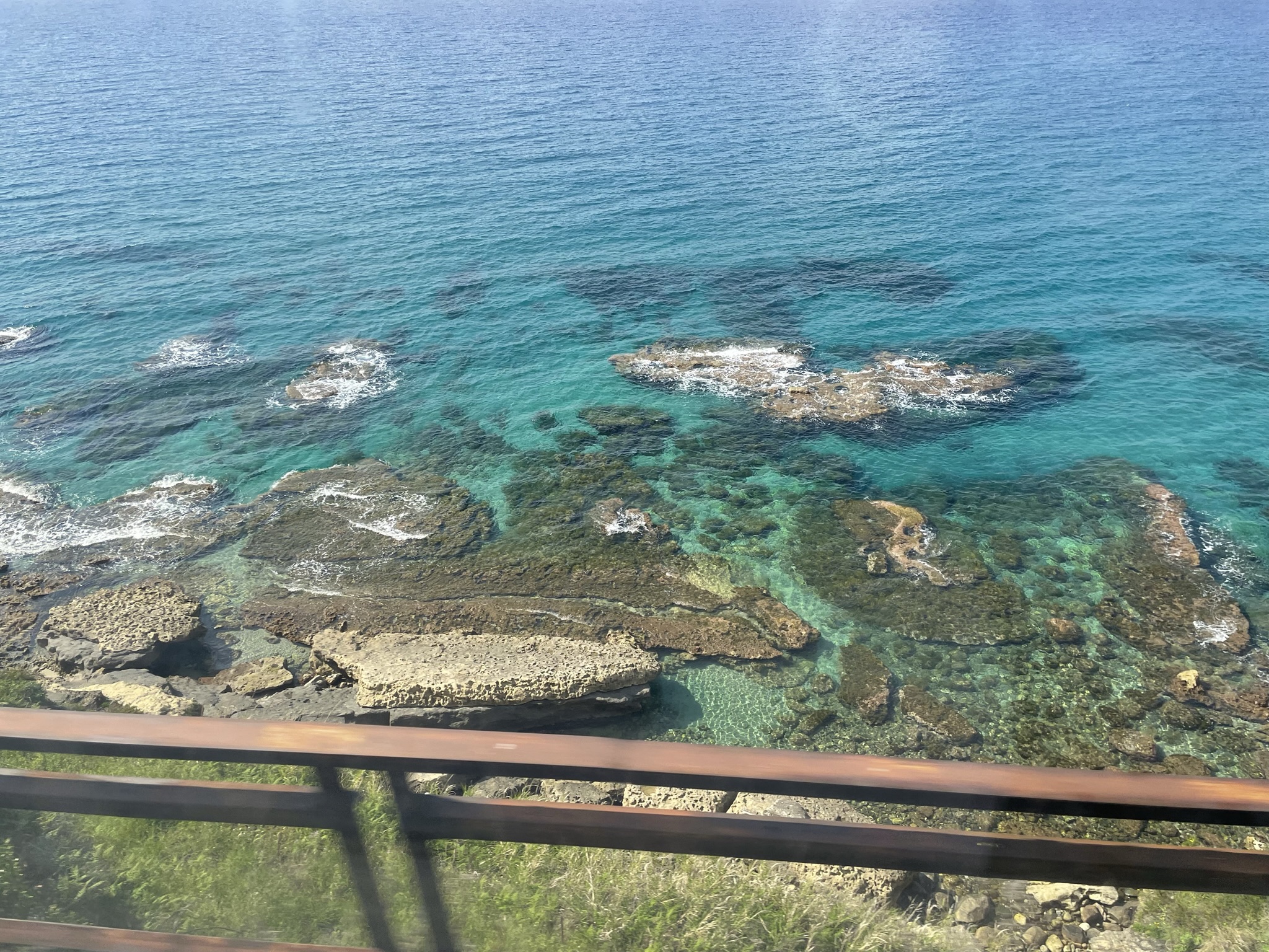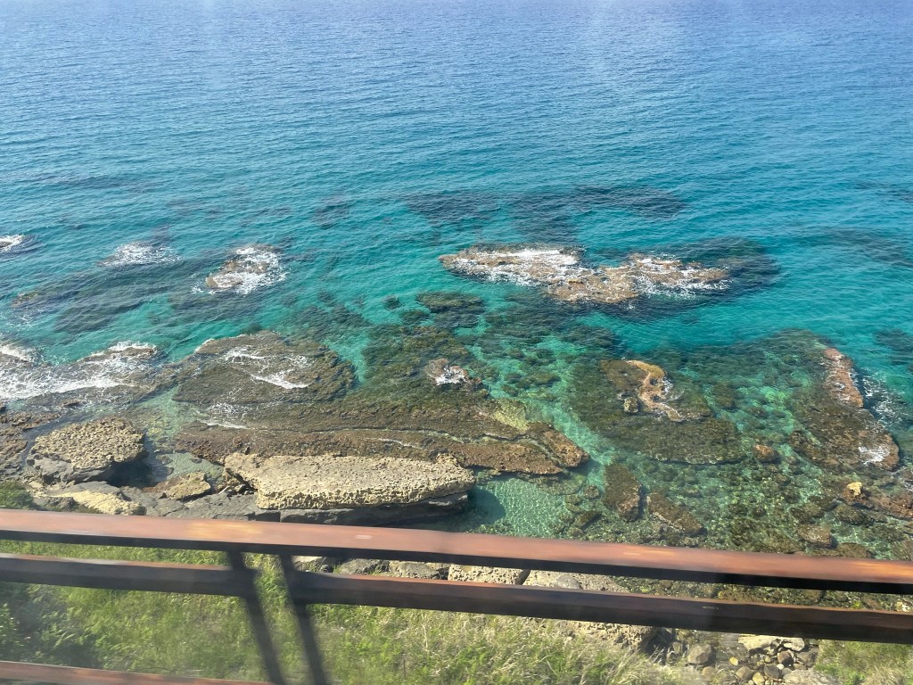 The Inter city train. Technically we are 1st class… but a continual high pitched noise from the aging air conditioning system, plus equally ineffective lavatorial systems make the journey less comfortable than it should be. Added to that is the strange behaviour of another passenger and young men who tried insisting they could smoke in the doorway of the carriage. All is fine, the views are good and the seas are beautifully azure.