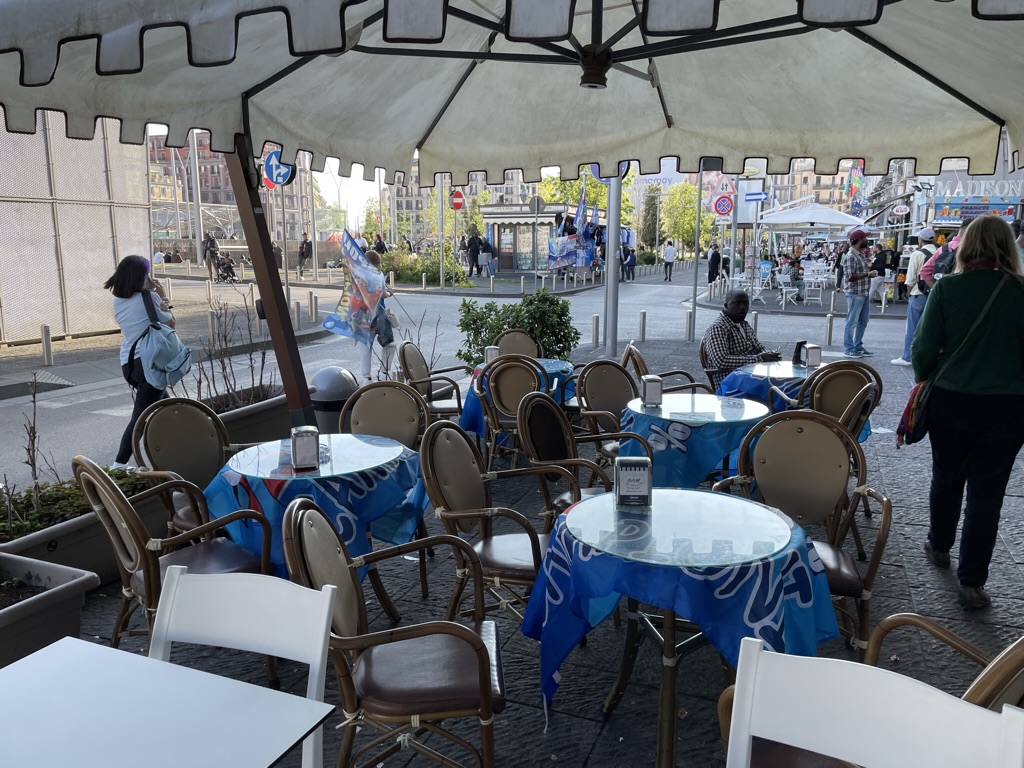 A wonderful restaurant we’ve used before….. but in this case the camera lies. There has been continual noise outside, including explosions, and now inside a series of celebratory actions… very noisy, including whistles…..Thankfully we are in a corner….. but the atmosphere is fantastic and along with other less enthusiastic locals we wear benign smiles!