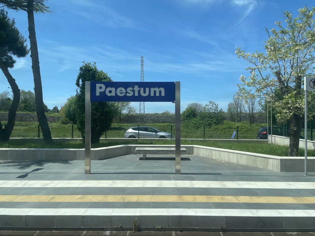 The low stone wall behind the sign is part of the boundary of an important Greek city: _Paestum contains three of the best-preserved ancient Greek temples in the world_ https://en.m.wikipedia.org/wiki/Paestum