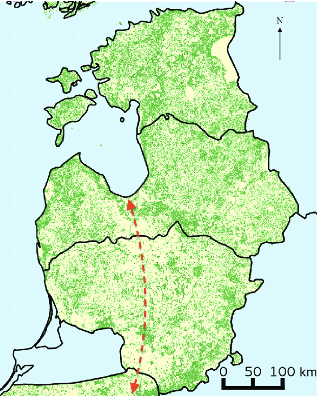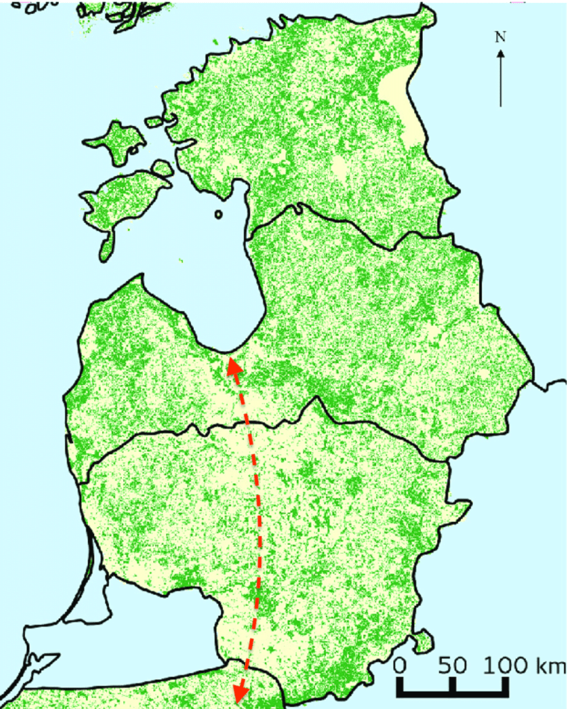 Our route in Lithuania and Latvia has been through a largely arable landscape. The greens on the map below show how much land is still forested (considerable, compared with many other parts of Europe)