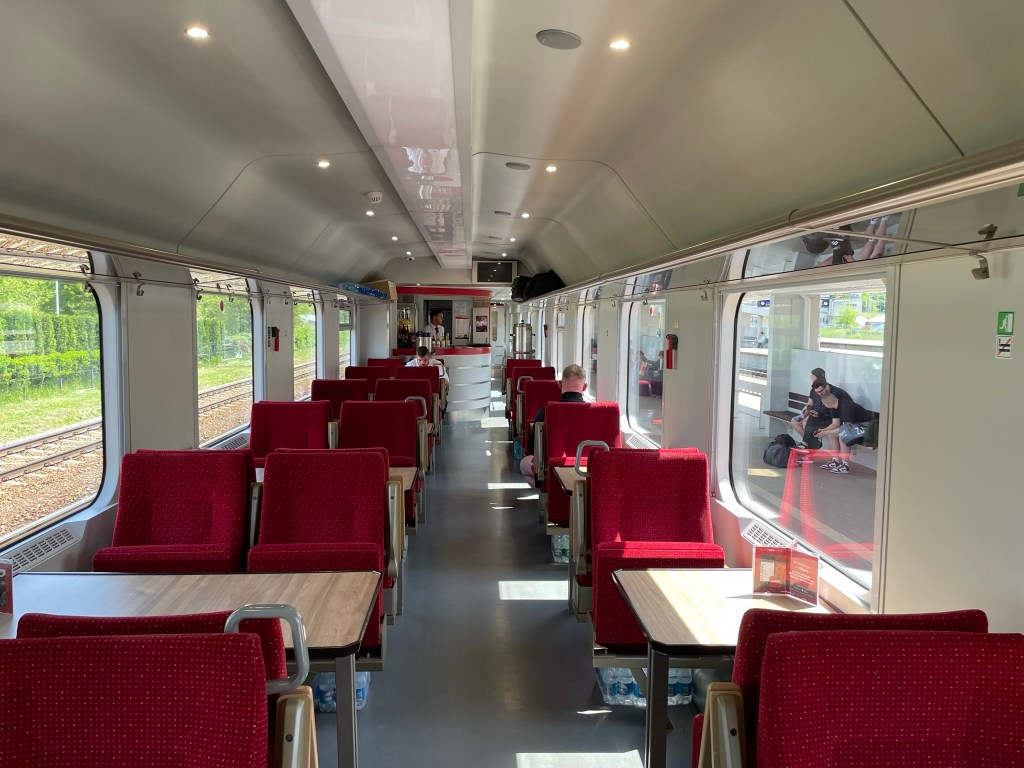 Very smart (renovated) train for the Berlin Express. The bar and restaurant are open before we leave (still 15 minutes to go). Fine menu. ……… Poland, Czechia, Slovakia, Austria all provide good dining facilities. German railways are ok but the others disappoint. Have yet to try the new Welsh dining car service (Cardiff – Manchester/N Wales).