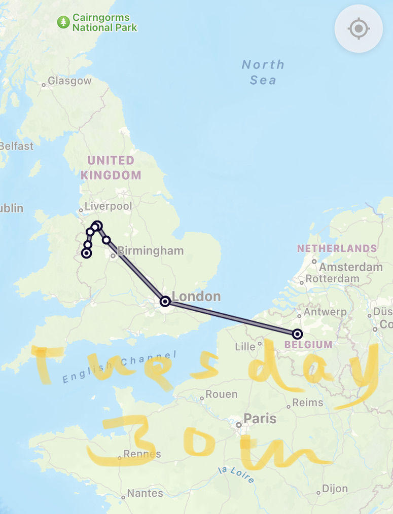 Sometimes chaos works to advantage. Today our Eurostar train to London is severely delayed….. but we reached the terminal in time to be transferred to an earlier train which (we hope) will prove ‘advantageous’….but there is a long journey ahead and there are many potential hazards…. For now, we leave Brussels one minute early.