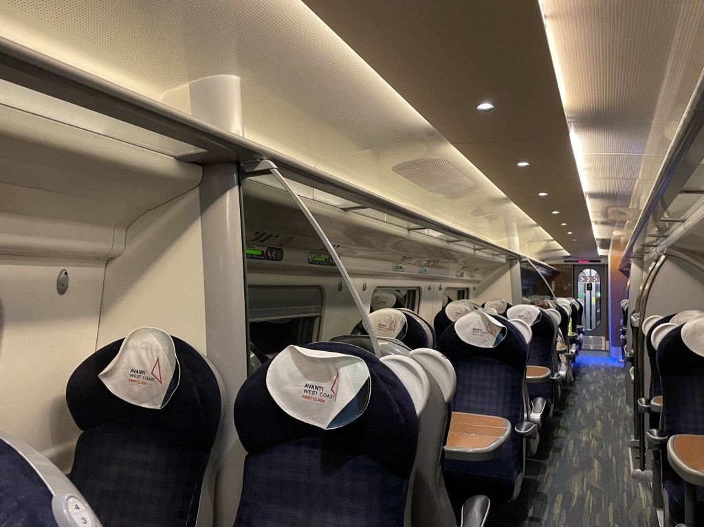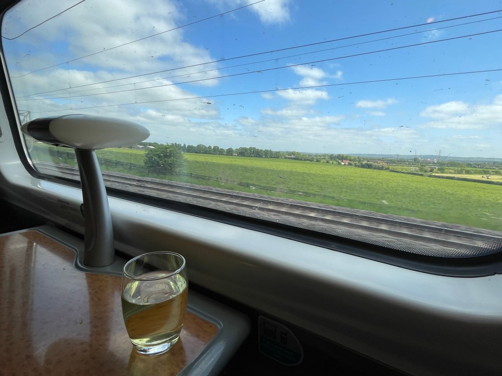 Thanks to railway staff who knew about our Long Journey, we’ve been upgraded. The train crew is from Liverpool so there was a considerable amount of jolly comment as drinks were served: ‘no singing or dancing’