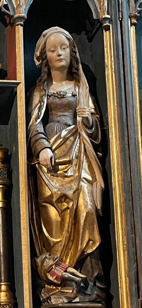 This is Margaret of Antioch: one of the Fourteen Holy Helpers, a collection of saints that probably became grouped as a ‘collective’ during plague times. 3 were Virgin martyrs