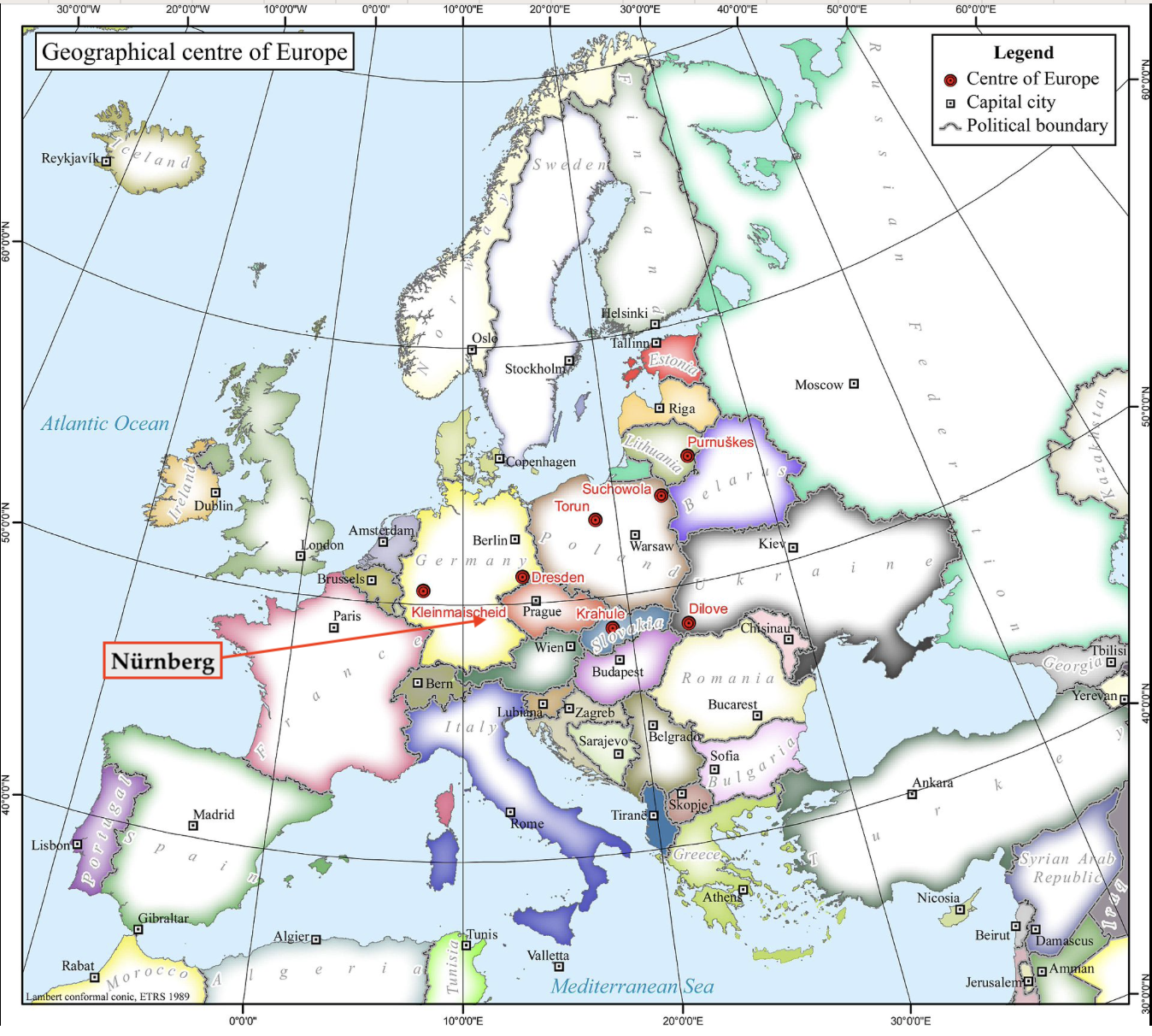 Shortly after the collapse of communism in central and eastern Europe I read that the changes had returned Nürnberg to its position as the city at the centre of Europe.