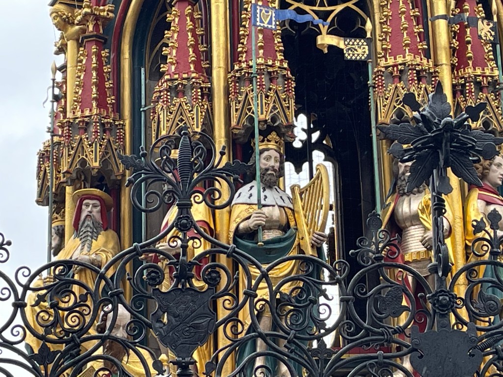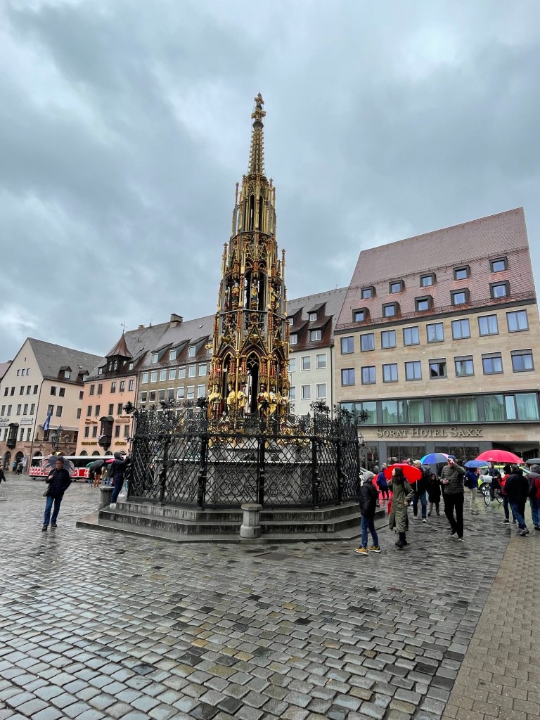 Between the 2 churches is the Hauptmarkrt & with its decorous C14th Schöner Brunnen