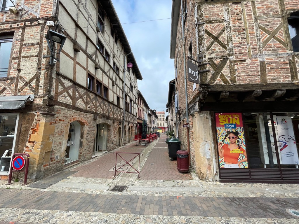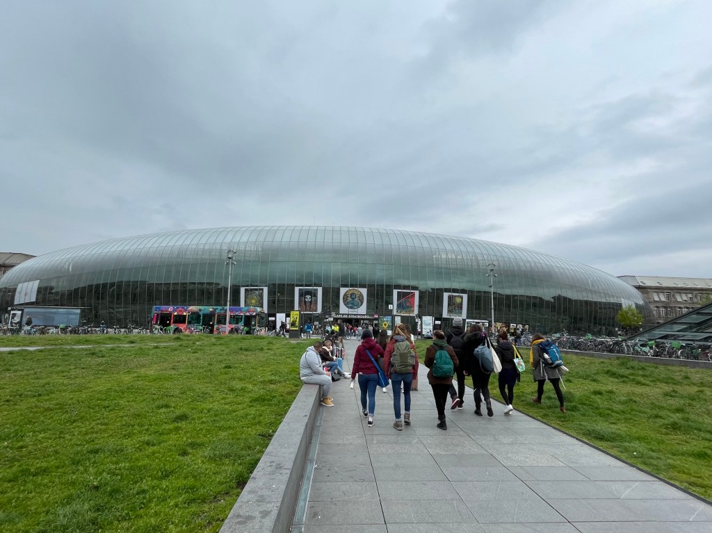 In Strasbourg (briefly) but with just time enough to walk away from the station. Incredible how national characteristics can appear ….. Strasbourg was a free city of the Hoky Roman Empire until the Sun King (L14) took it. It is directly on the border with Germany, separated by the Rhine river. Yet walking out of the station is immediately different. This morning we behaved properly and stood at a red light waiting for the green (despite no traffic)…. Here there is a red light but no traffic…. so everyone walks . And the first place we encounter is a classic cafe… so time for an excellent coffee and cream and a macaron (maybe a ‘madeleine’ would be more appropriate for this tour)