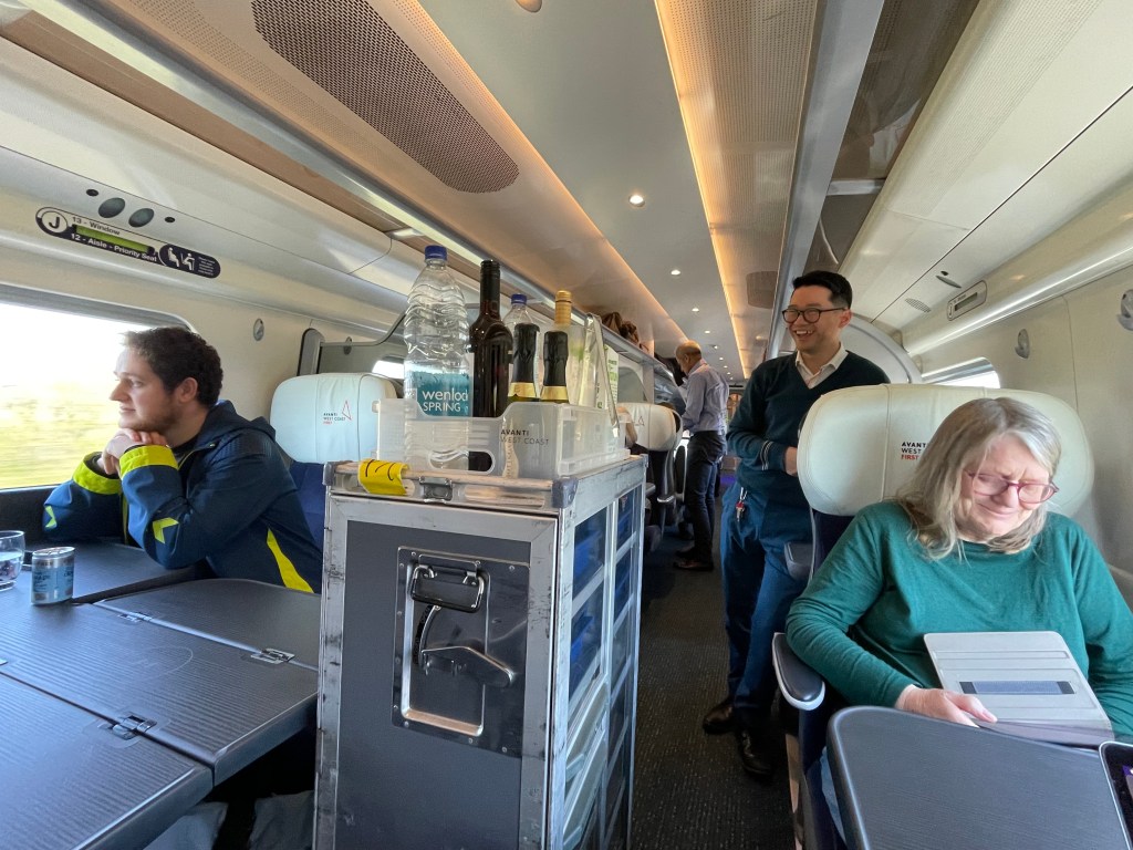 In U.K. heading for Wales on train to Manchester…. Restoring faith….. great guy serving drinks…. Most cheerful service since Romania…. Long chat about trains and service quality…. And….. our windows are properly clean (unlike TGV & Eurostar).