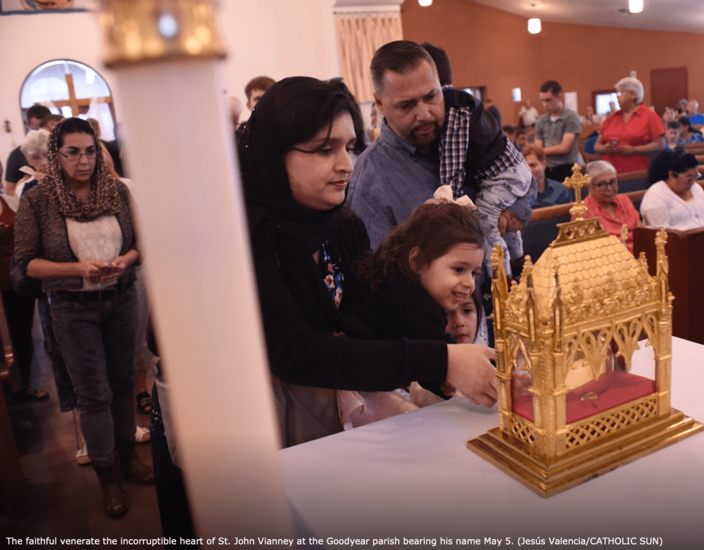 GOODYEAR — The incorruptible heart of St. Jean Vianney, who used the confessional and his gift of reading hearts to lead thousands of central Europeans away from sin and toward devotion to God during the mid-1800s, made its way through the Diocese of Phoenix this month as the Knights of Columbus opened the Southwestern leg of a national tour that has seen thousands of pilgrims, clergy and church representatives venerate the first-class relic.