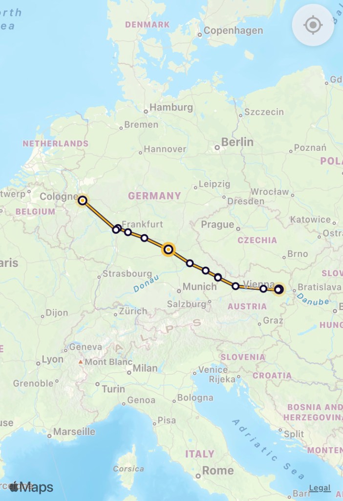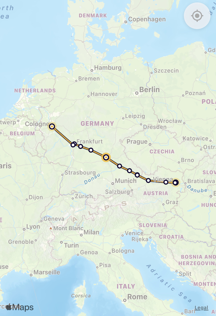 … (Wednesday) we cross from the Rhine (flowing north) to the Danube (flowing east). When crossing the continent this was always significant…. Air flights do not provide this sense of culture, history and even still (fortunately) social reality. We are taken and dropped…. And have no time to recognise important change. For me the marker of this European change was ‘the onion domed’ church…. As I recall, a moment first realised in 1980 somewhere near ULM in Germany (it drew on memories from 1968…. More of which later in this journey). Now, until 19.42 hr, we are in Wien.