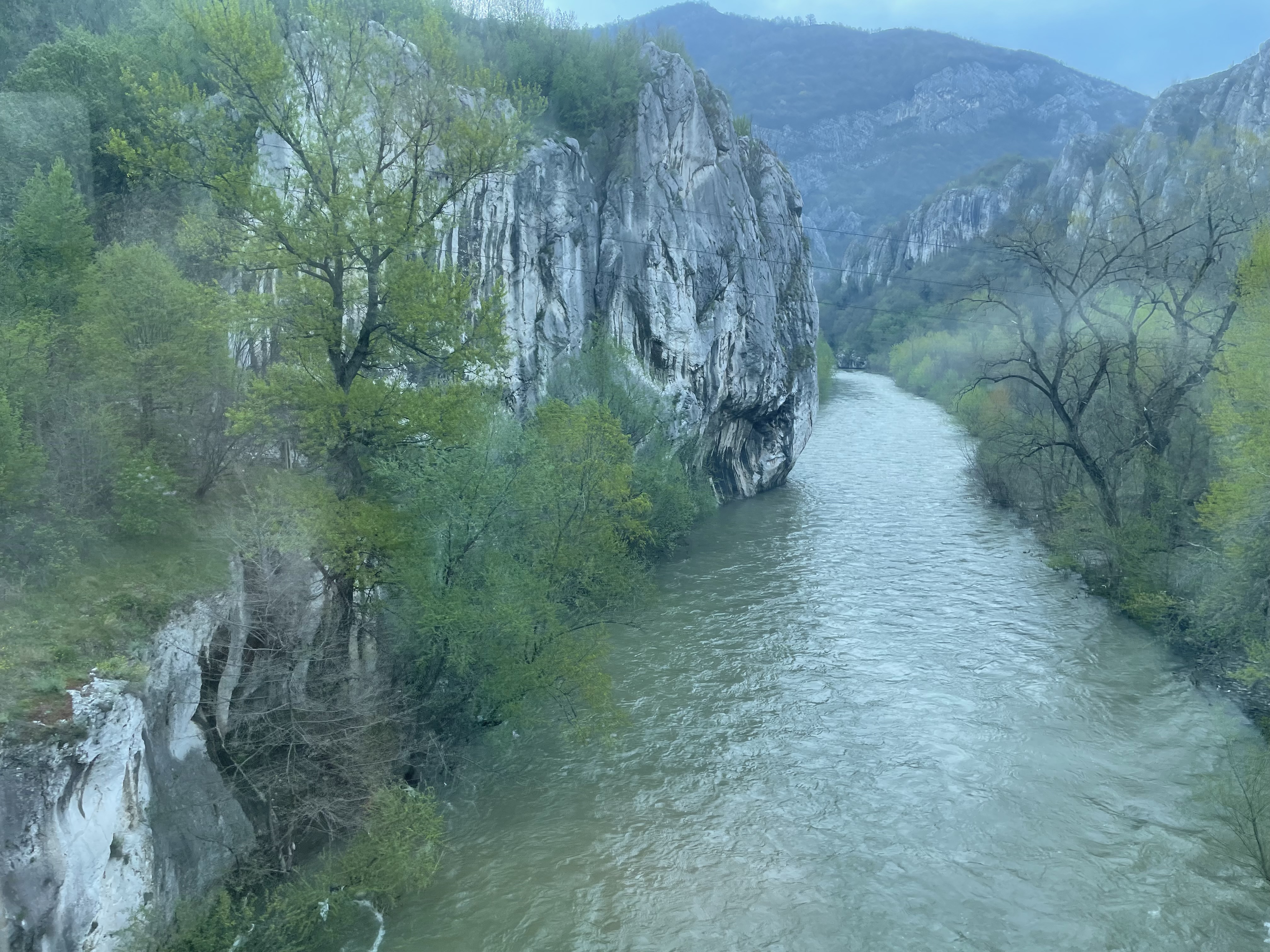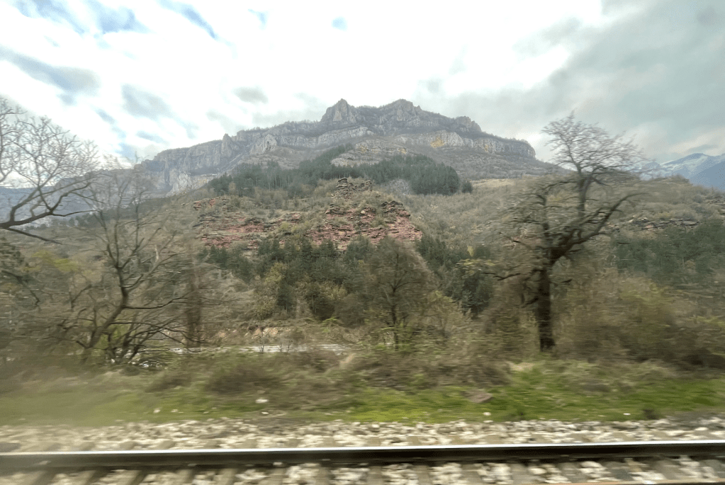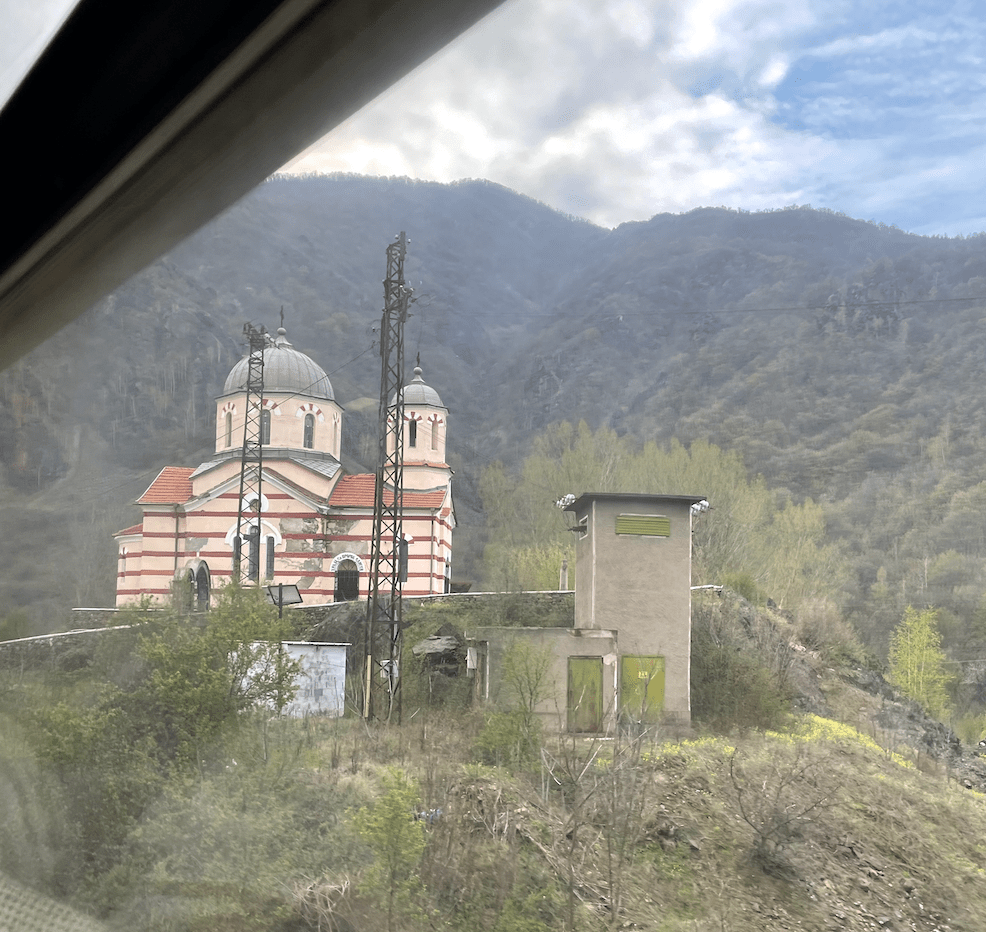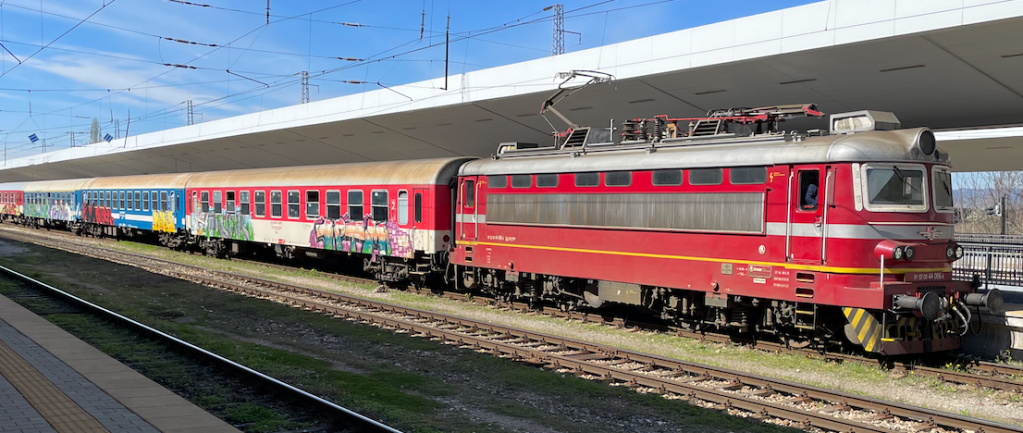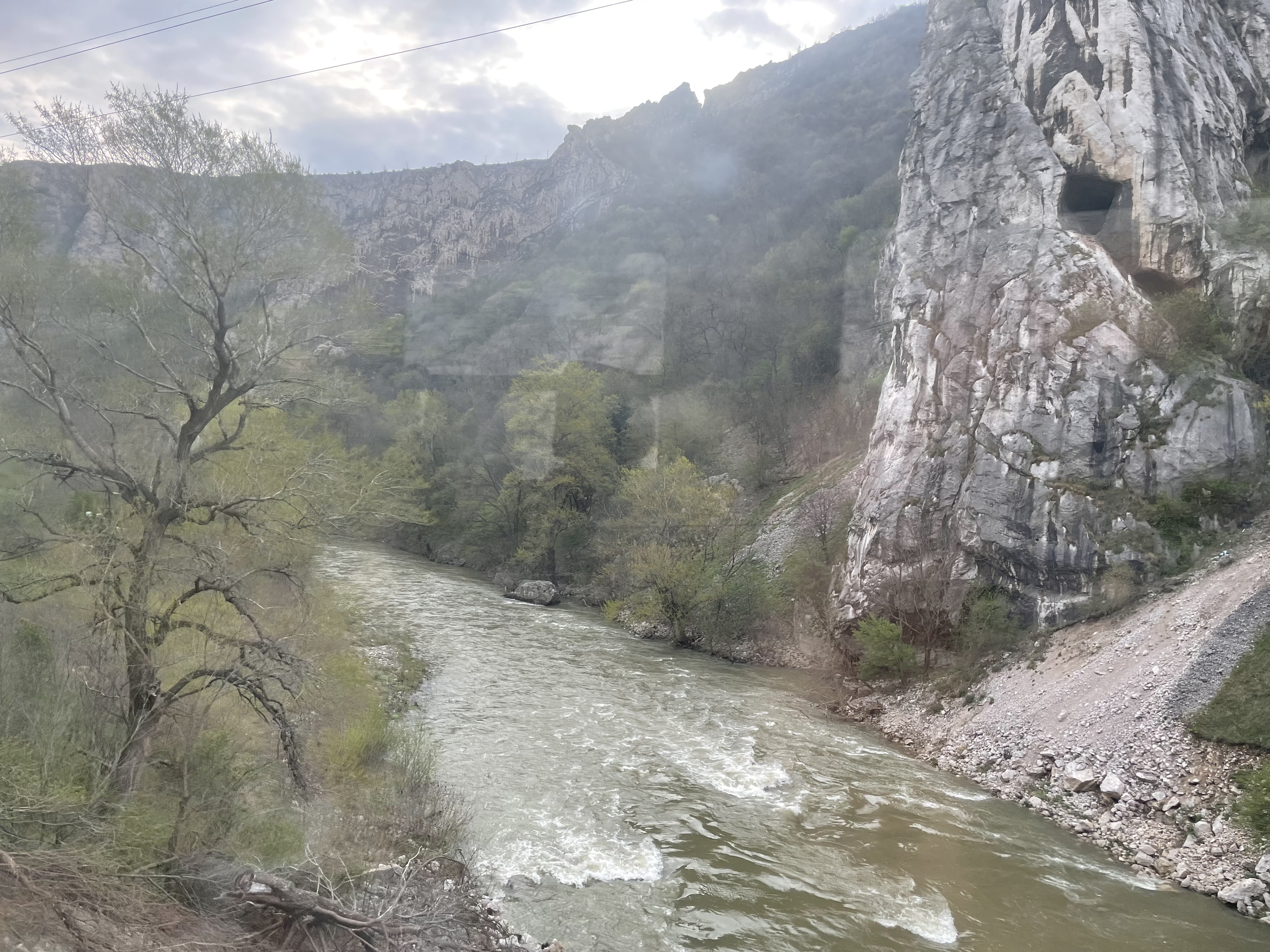 A comfortable train following a route that is being upgraded, with dramatic scenery as it crosses the Balkan Mountains.