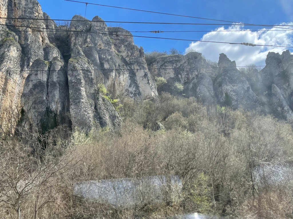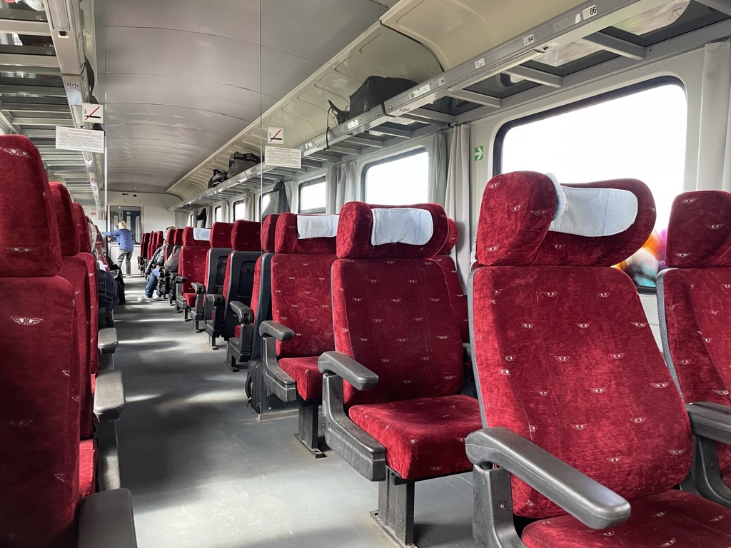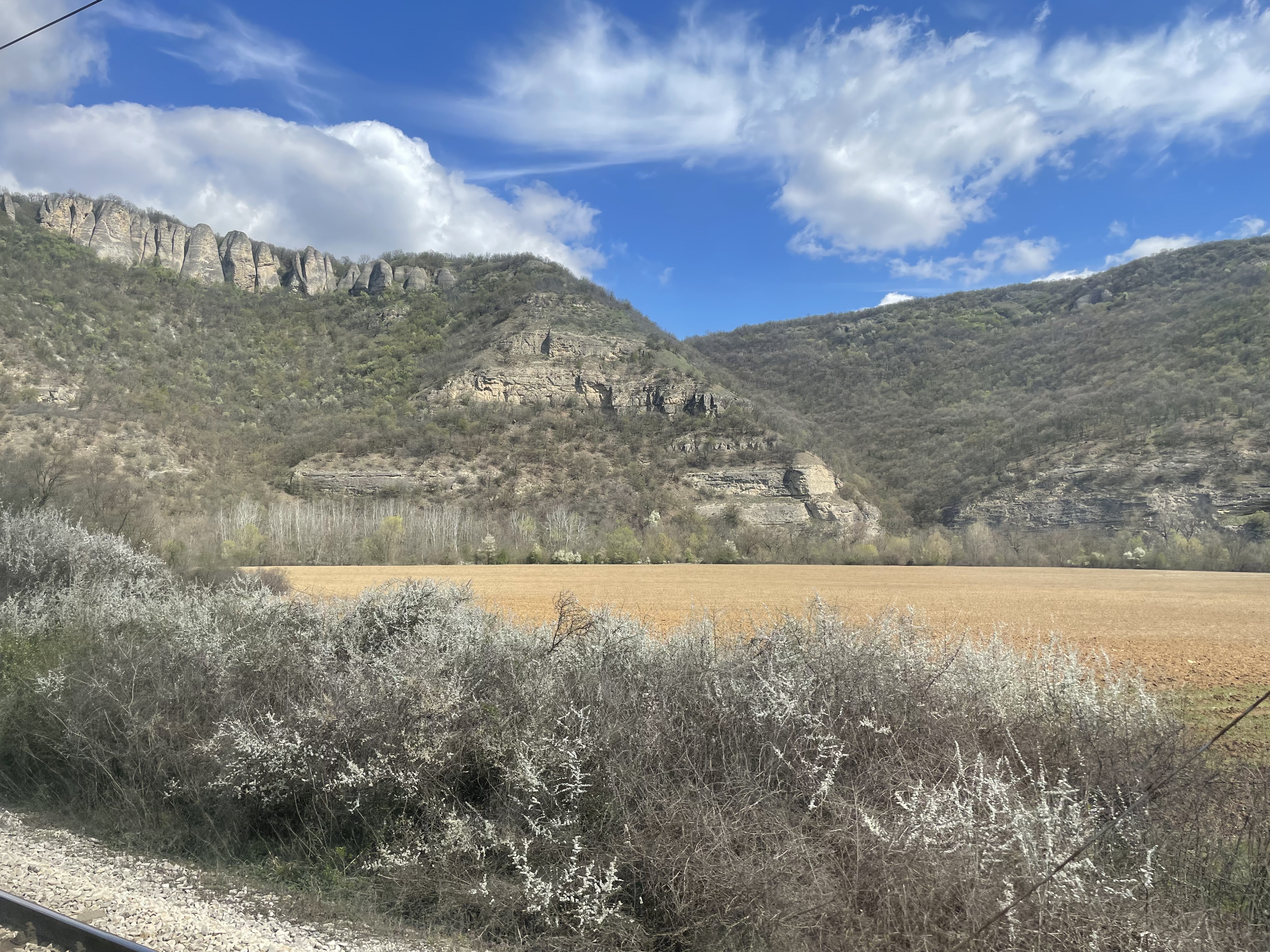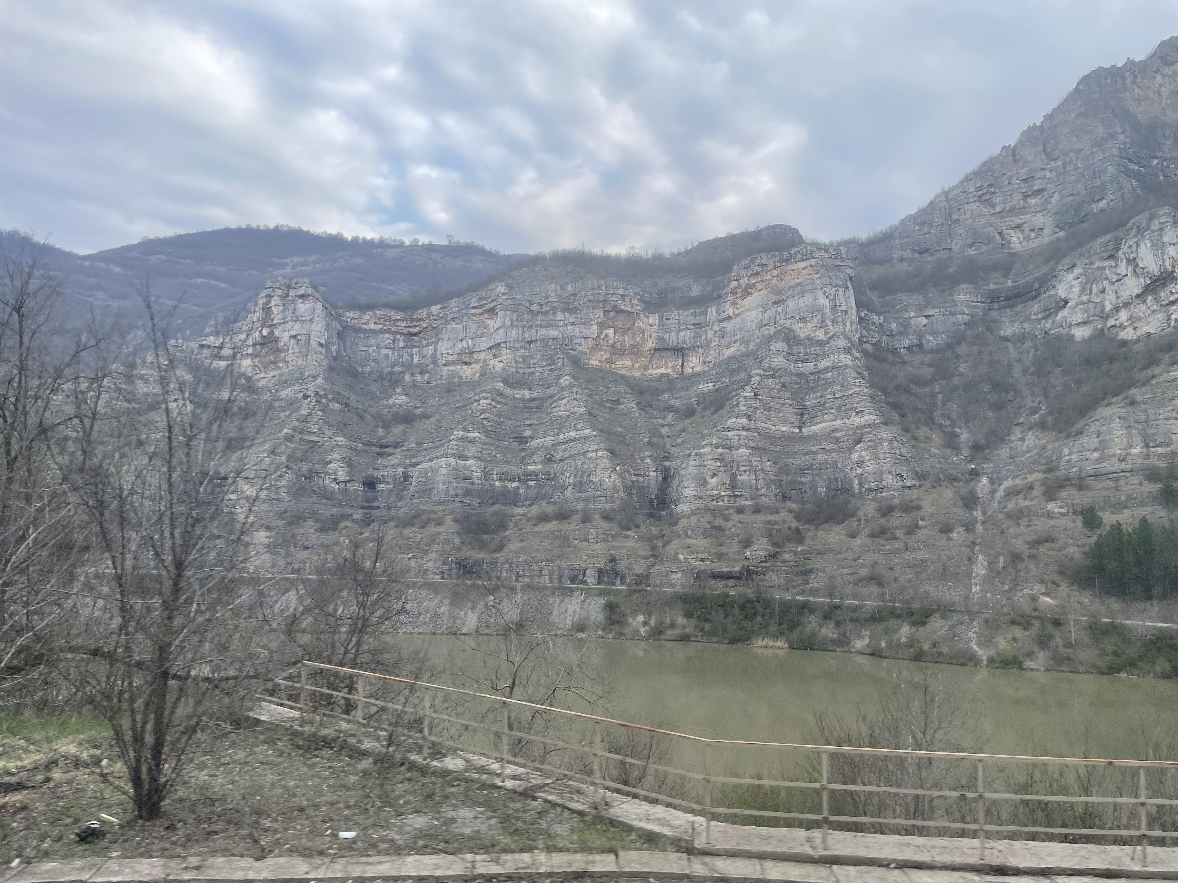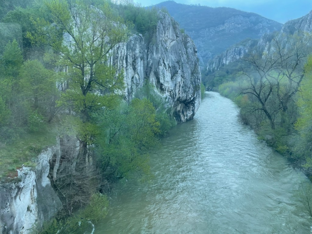 A comfortable train following a route that is being upgraded, with dramatic scenery as it crosses the Balkan Mountains.