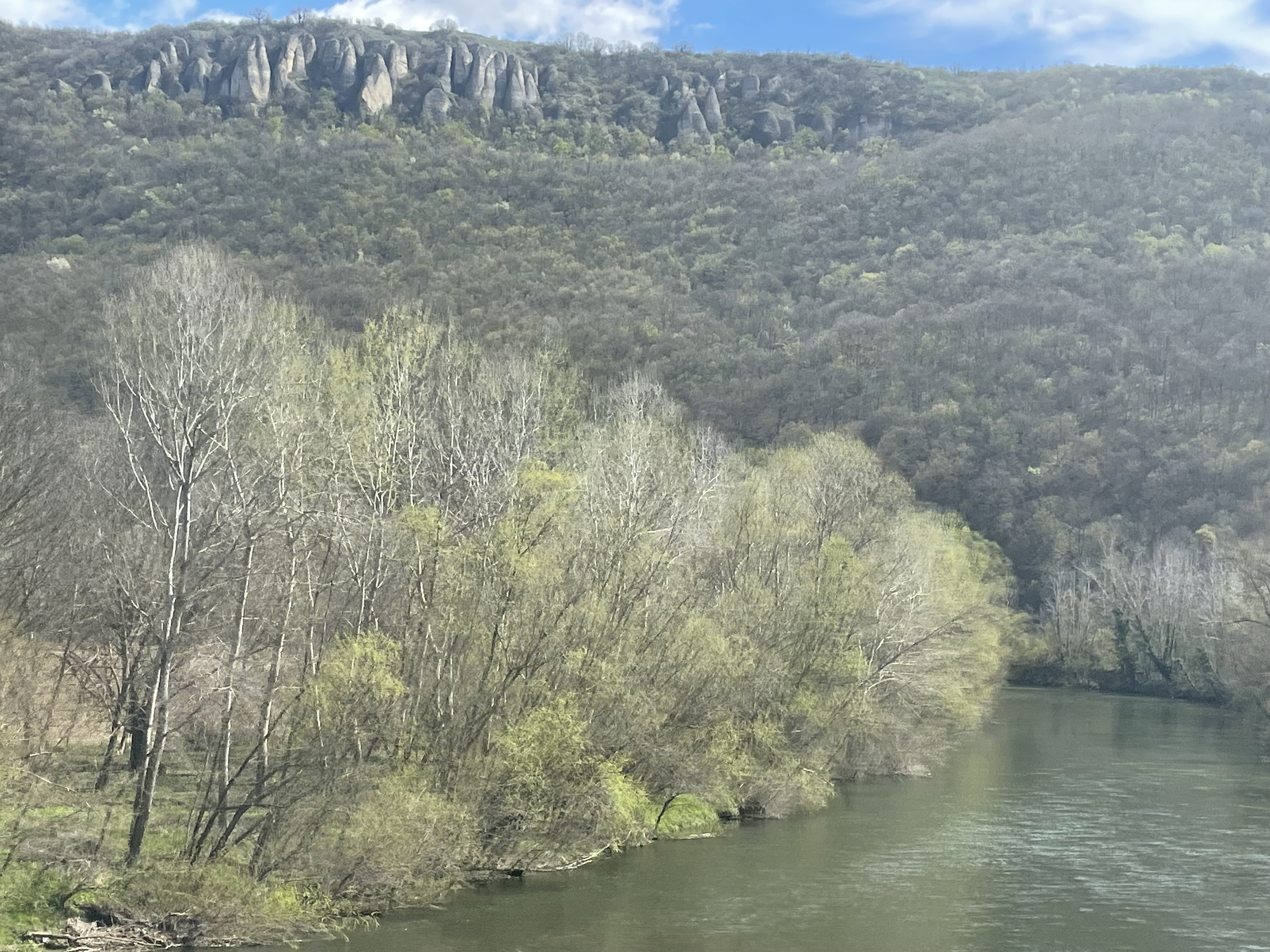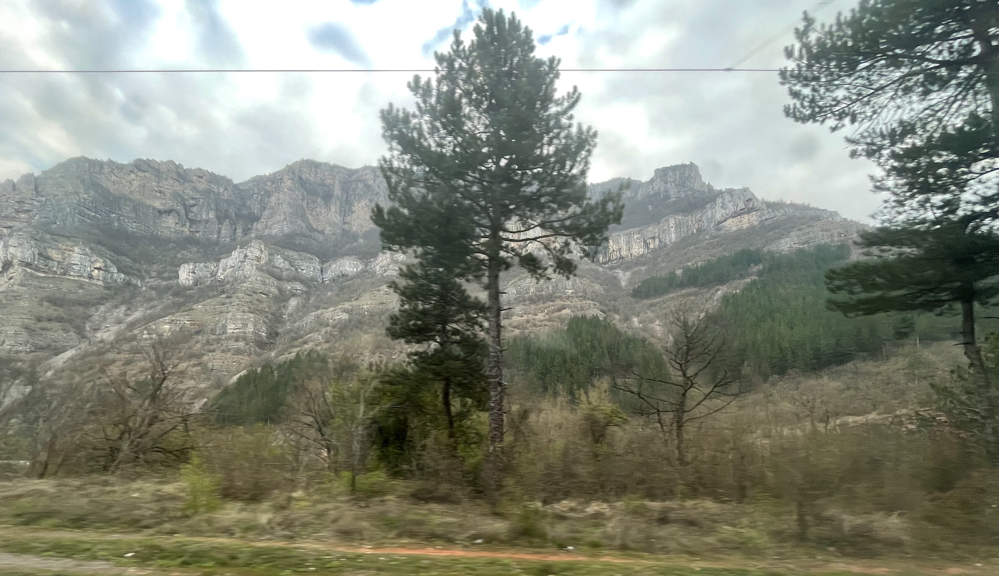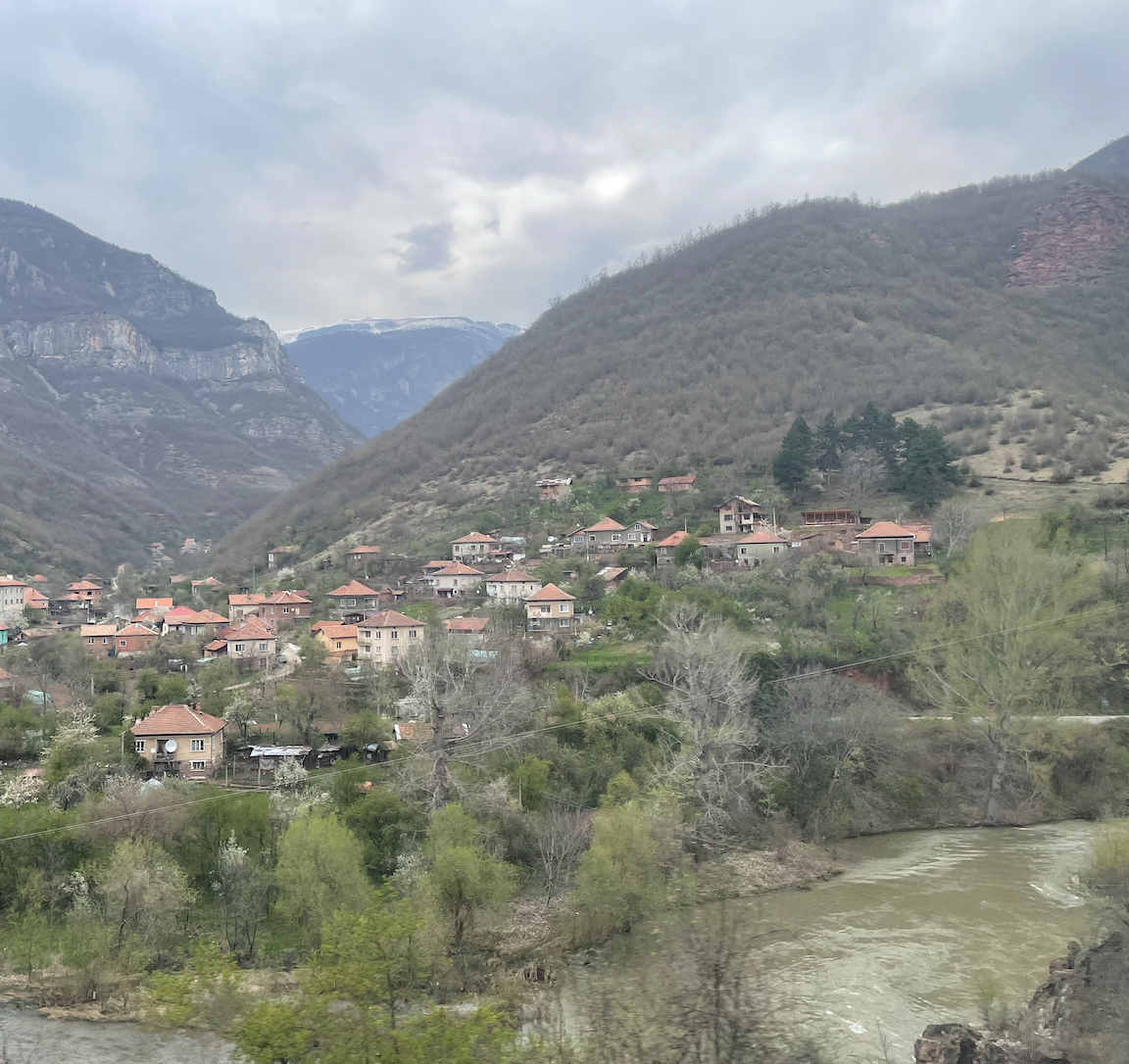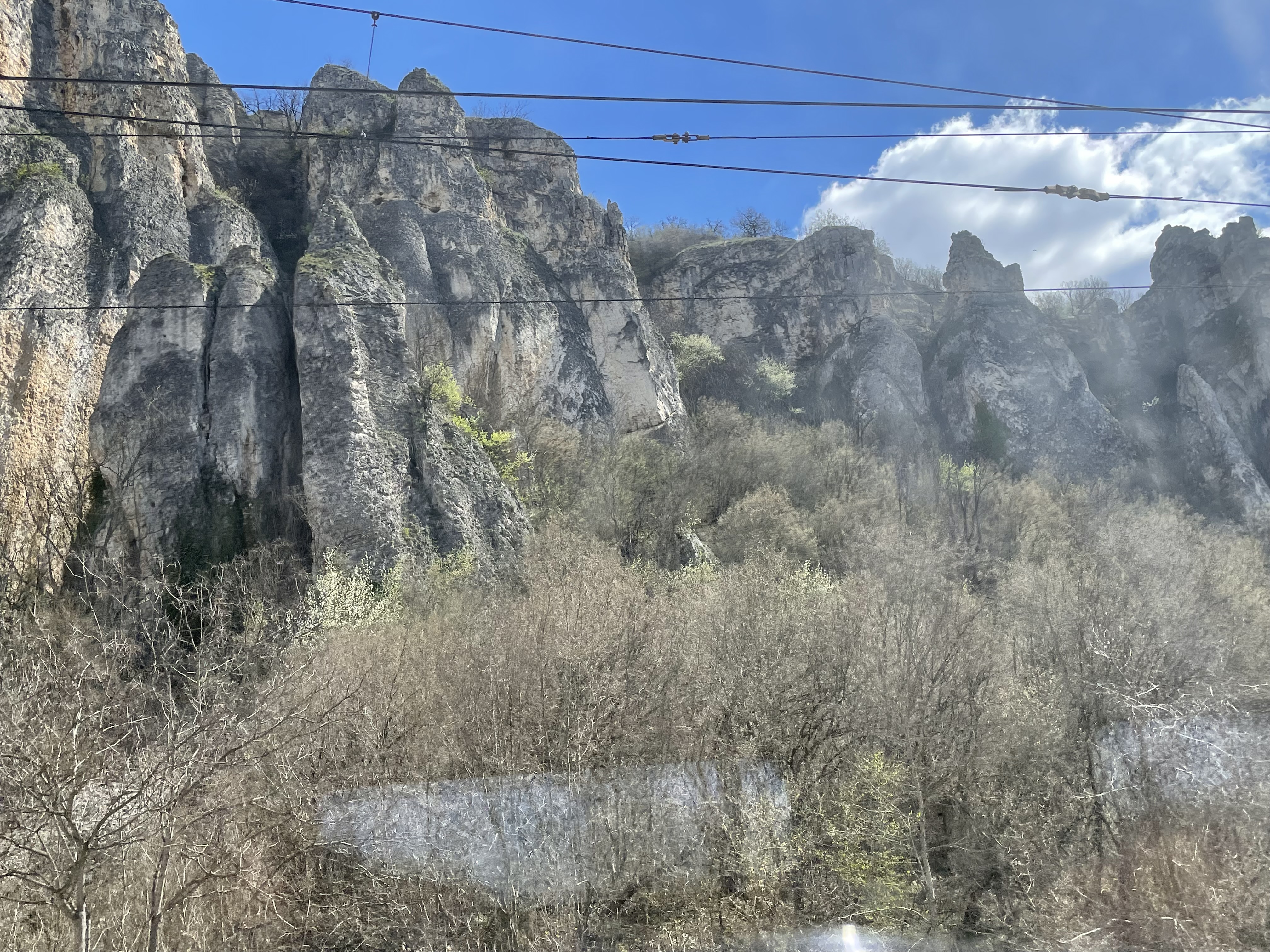 A comfortable train following a route that is being upgraded, with dramatic scenery as it crosses the Balkan Mountains.