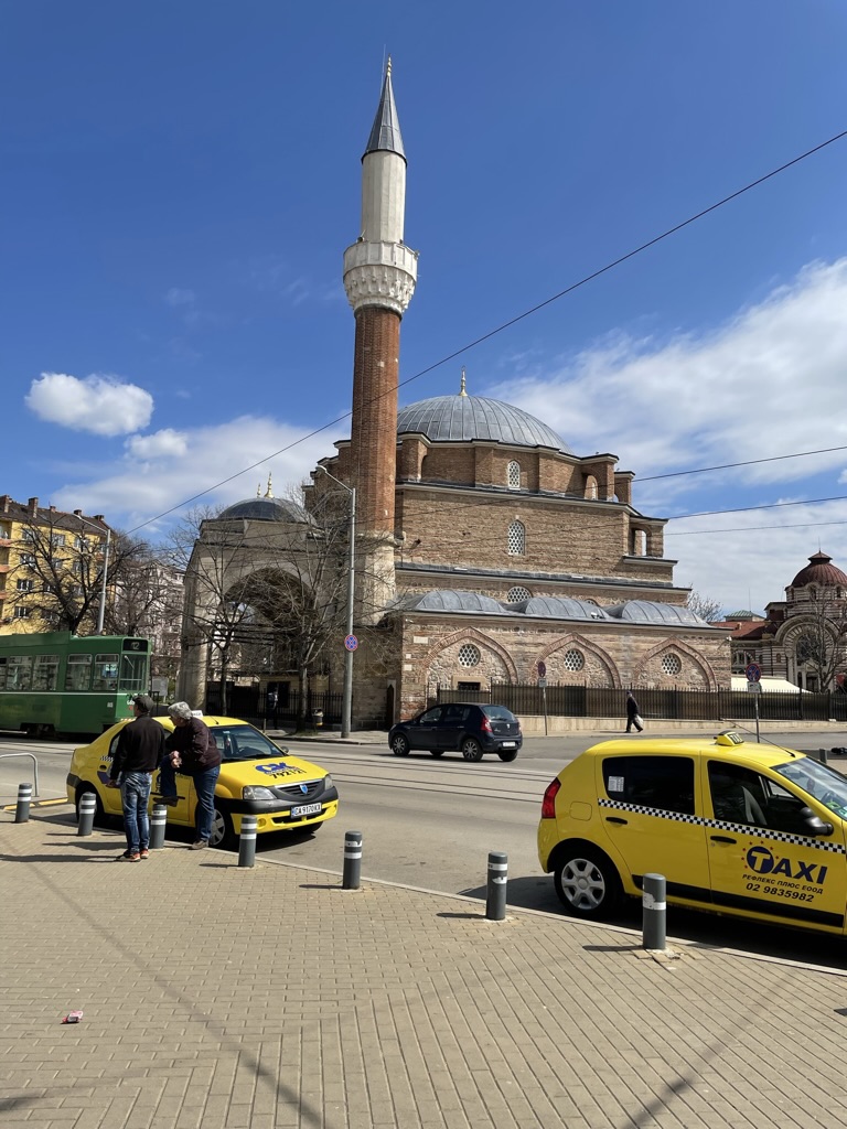 Since the time of the Ottoman Empire, Bulgaria has had a significant Muslim population. (presently around 10%). Buildings, in a style emblematic of a more recent controlling power are nearby