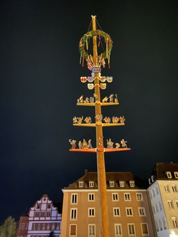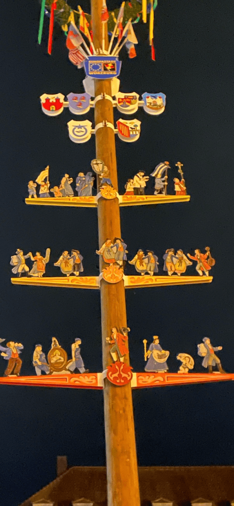 The decorated pole seems to represent something relating to the foundation of the town & the present significance of Würzburg – as a place of celebration (and inebriation…? – not our experience). Important to record, as over the centuries, being a place of significance it has contained periods of considerable suffering (culminating in a WW2 bombing & firestorm worse, in scale, than at Dresden).