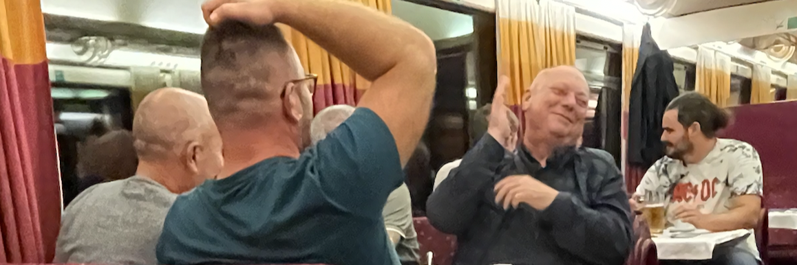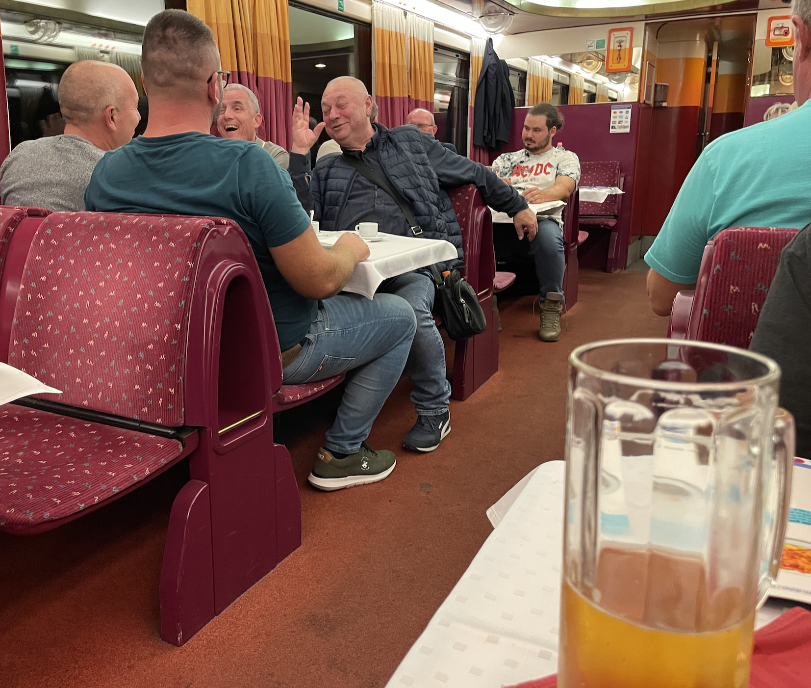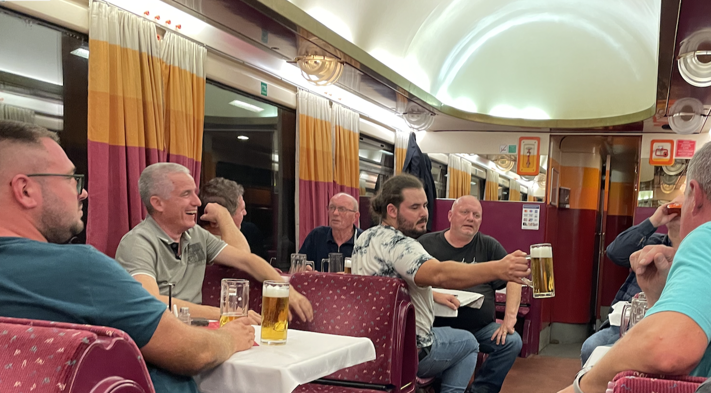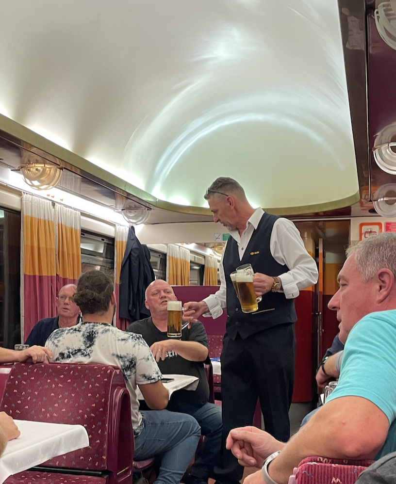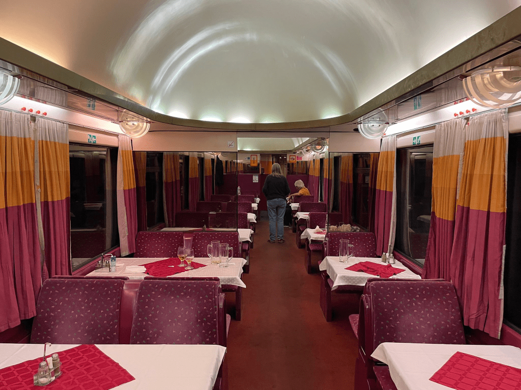 The dining carriage had a rather old style Hapsburg Imperial look….. but the evening was more like a farmers gathering in the Sarn inn