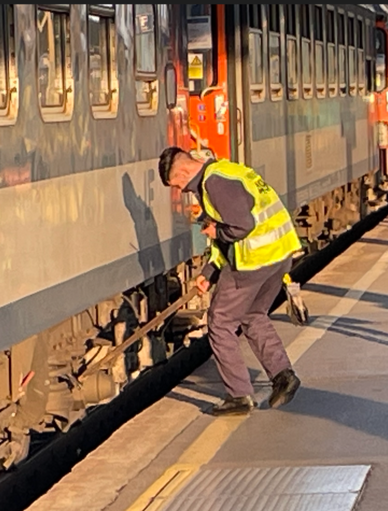 Seeing a member of staff examine and then prodding parts of the (rather old, communist era) train creates a degree of uncertainty for those observing.
