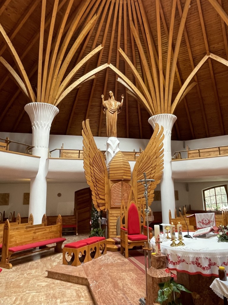 The statue of the Resurrection behind the altar is the work of the sculptor Nagy Ödön from Csíkszereda.https://www.explorecarpathia.eu/en/romania/csikszereda-miercurea-ciuc/millennium-church
