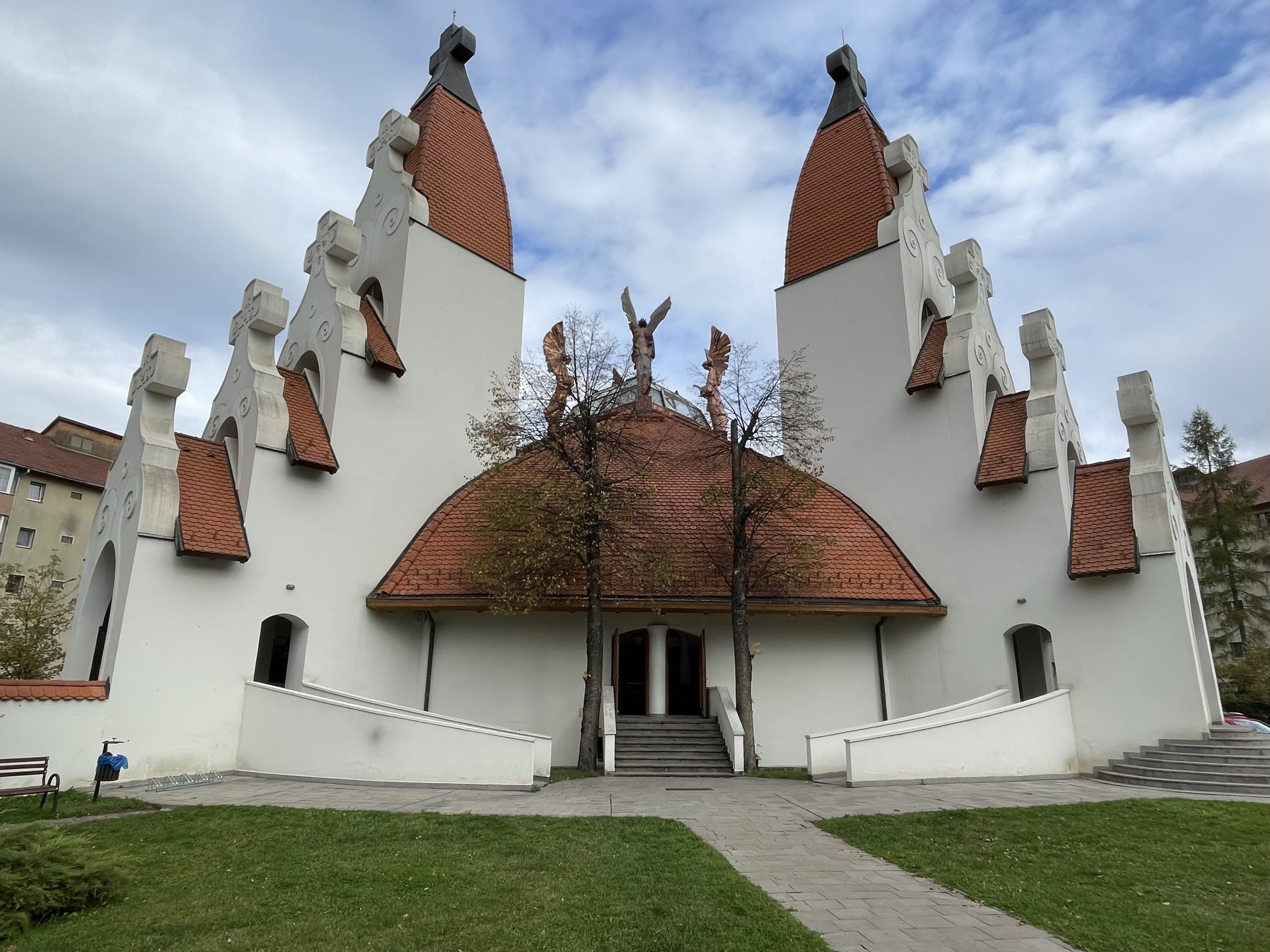 Moving along quiet streets into the town we saw a somewhat strangely shaped building & gradually realised it was some form of church.