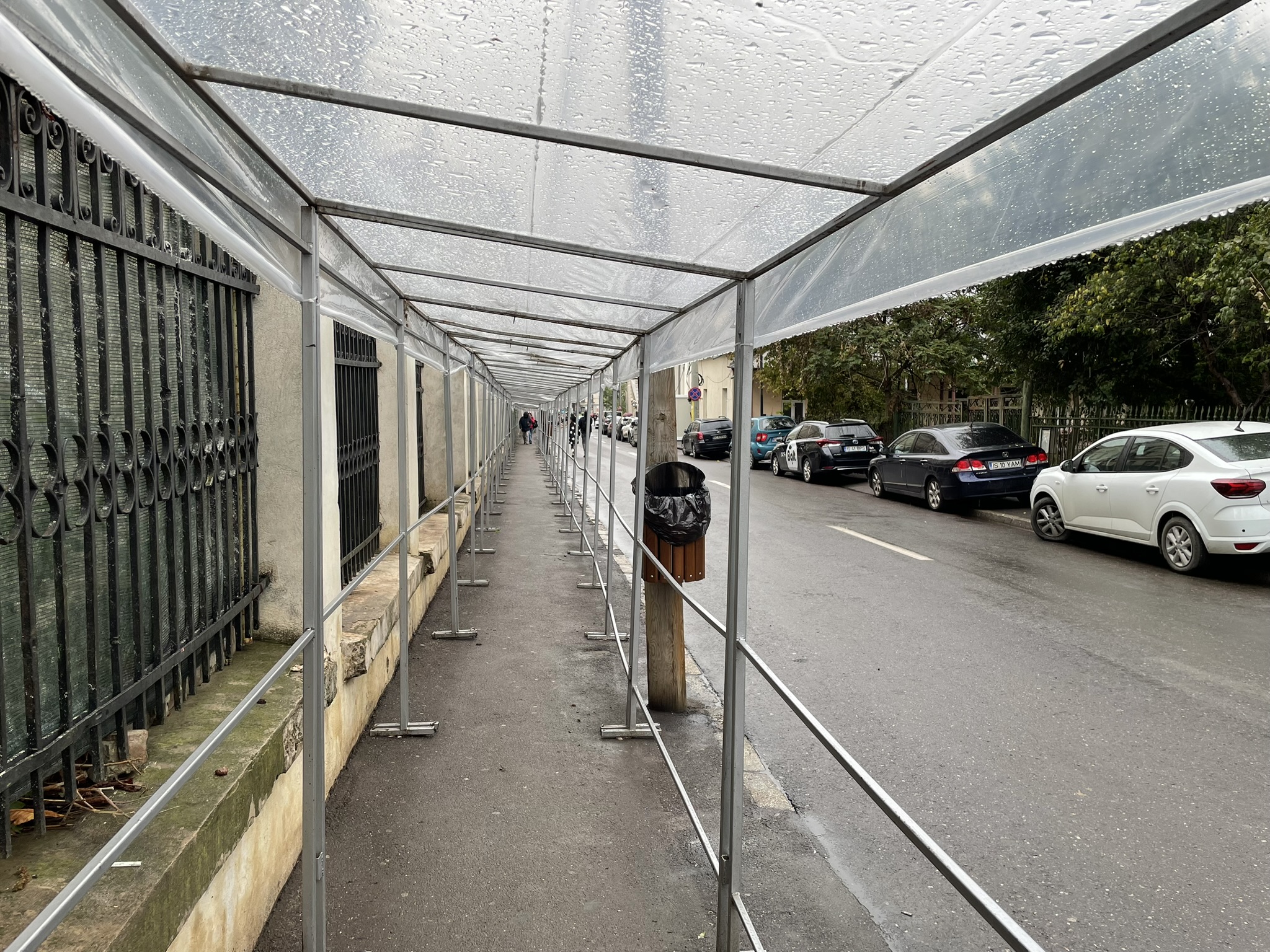 For us, there is considerable physical benefit in being able to remain dry in the rain, by using the now empty sheltered paths created for the visiting pilgrims.
