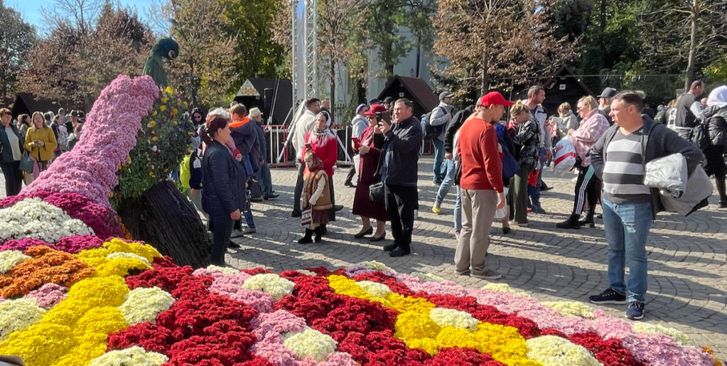 We escaped by passing behind the City Mayor’s proud contribution to the festival…. a floral peacock.
