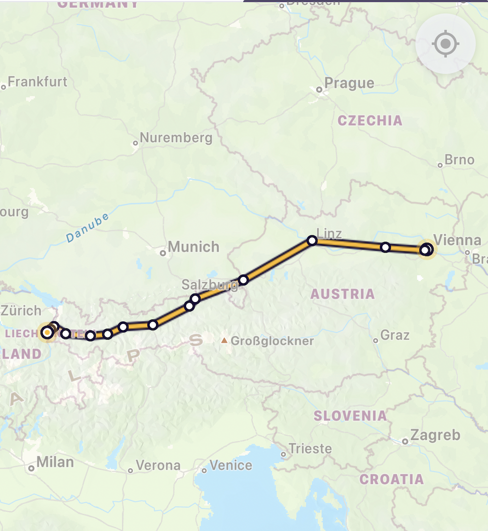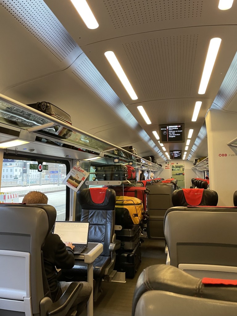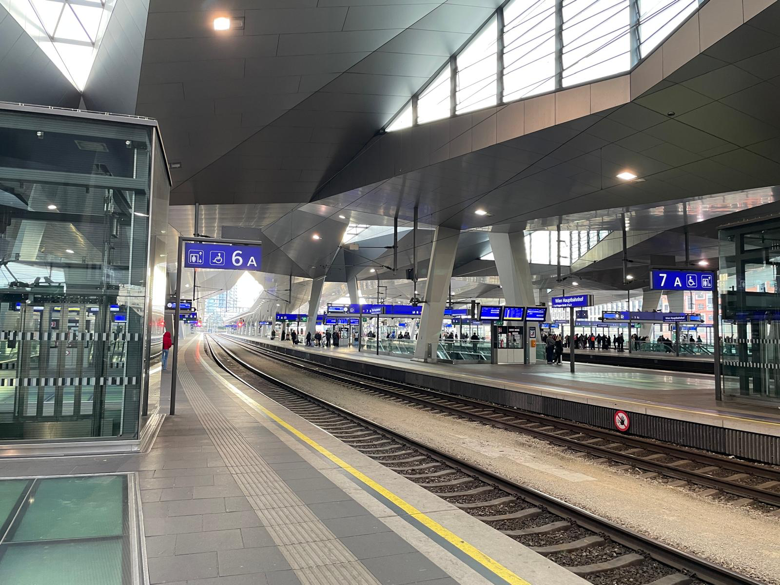 Wien: but only for 40 minutes. The impact of flooding has altered schedules & we quickly move platforms and board a train for Switzerland (including, en route, a small section of Germany)