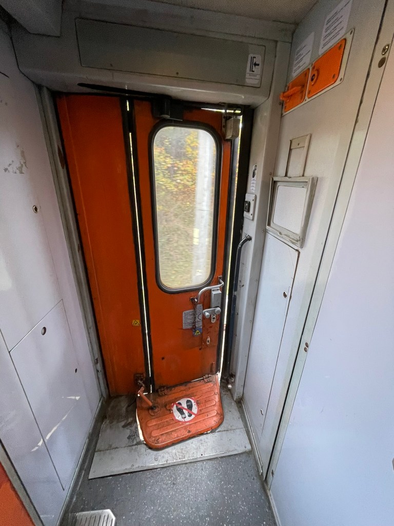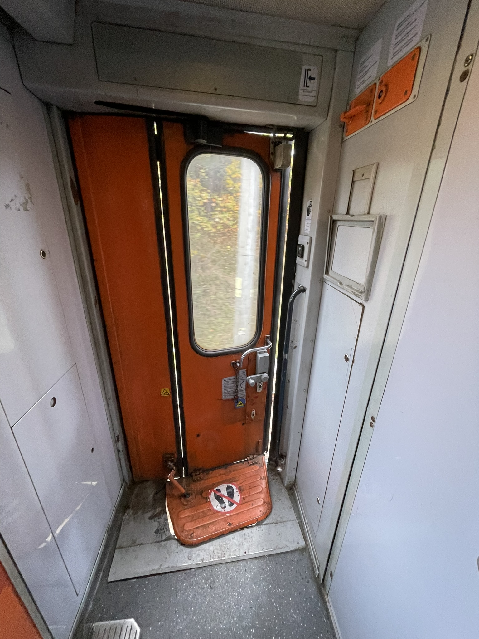 As it seems the door does not shut, the warning not to stand on the attached platform is appropriate!