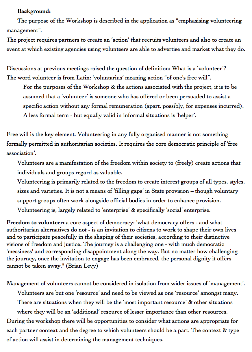 The following are the notes produced at the end of the Workshop and set out, in simple summative terms & with an outline timetable, the intentions of each partner.