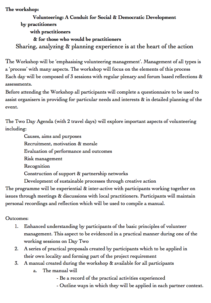 A conference presenting & analysing information about the volunteering process (distinct from the ‘Fair’ which will promote existing voluntary agencies)