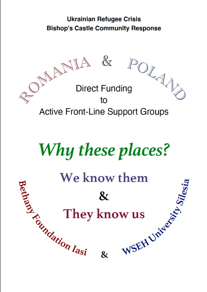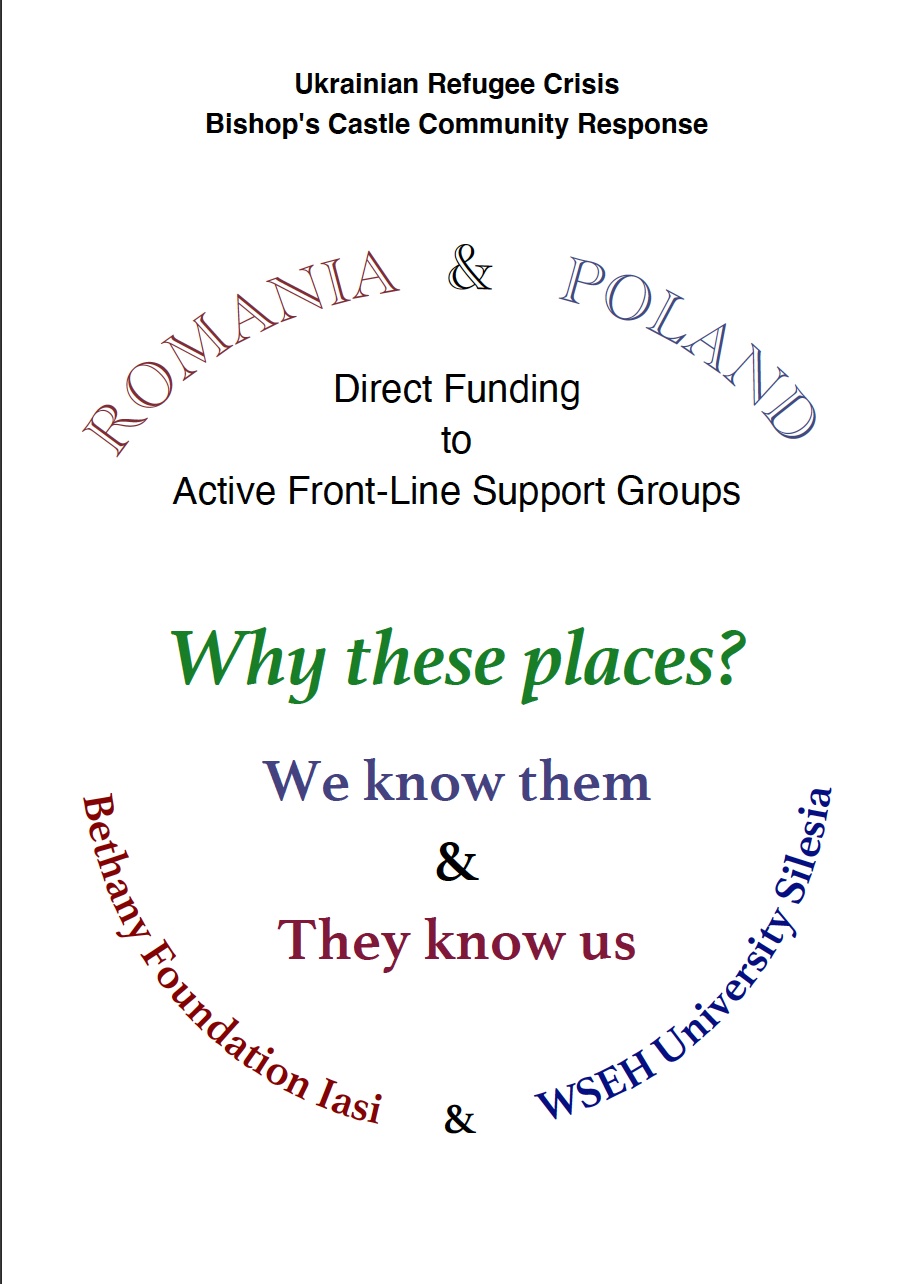 [Pathways ID is a not-for-profit company managed by volunteer directors (Company House Reg: 4367522). The company provided contacts with Ukrainian support groups in Poland and Romania & covered the costs involved in transferring the funding raised in Bishop’s Castle. They have also engaged directly, through visits, with the partners agencies in both countries.]