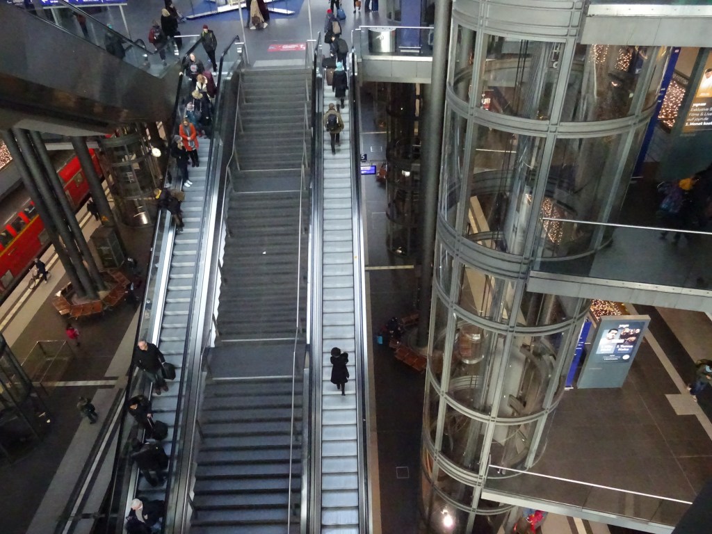 The train sits, we sit…. But the the Polish Border force walk the corridor checking – with one guy who was so well ‘kitted out’ with technical ‘kit’ strapped to his body (he scanned our passports with a device attached to his wrist – action taken without any form of speech) that he seemed almost completely cybernetic (except that his boots were clearly well used, indicating that there was some real person who presumably put them on, took them off, & occasionally polished) them lurking behind the devices.